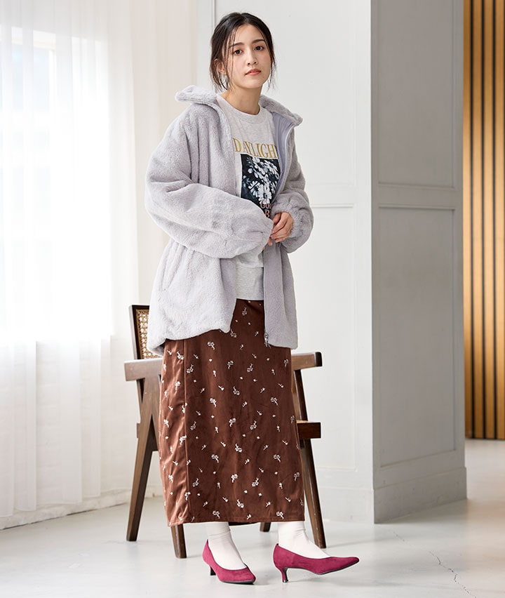 ・小花刺繍がポイントのナロースカート。カジュアルにもキレイ目にも着合わせ出来ます。