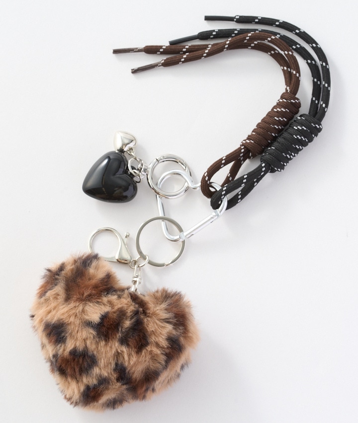 ・トレンドのコードとヒョウ柄をハート型のファーと組み合わせたチャーム。