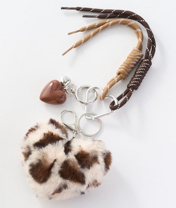 ・トレンドのコードとヒョウ柄をハート型のファーと組み合わせたチャーム。
