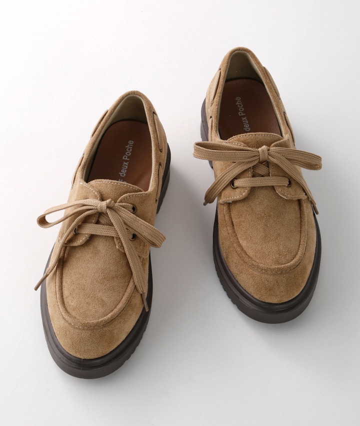 ・足元に適度なボリューム感を出せるデッキシュ―ズ。程よい‘きちんと感’が魅力的で、アッパー材に今期人気のあるスウェード調素材を使用したイチ推しアイテム♪