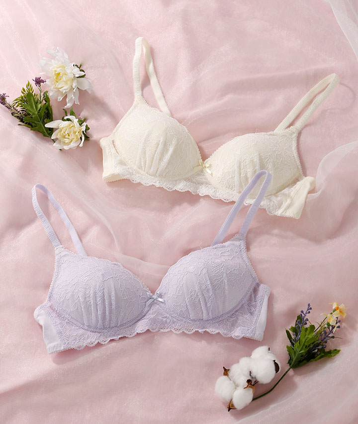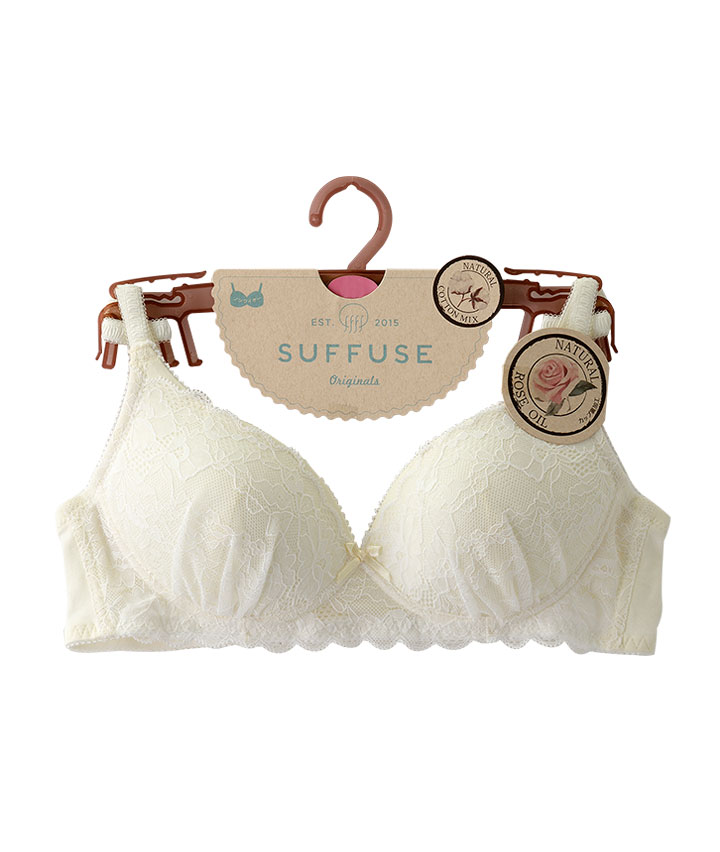 ・アンティーク調のラッセルレースがナチュラルかわいいカジュアルノンワイヤーブラジャー。ローズオイル加工で気分華やぐ&カップ裏コットンMIX素材でお肌に優しいつけごこち。