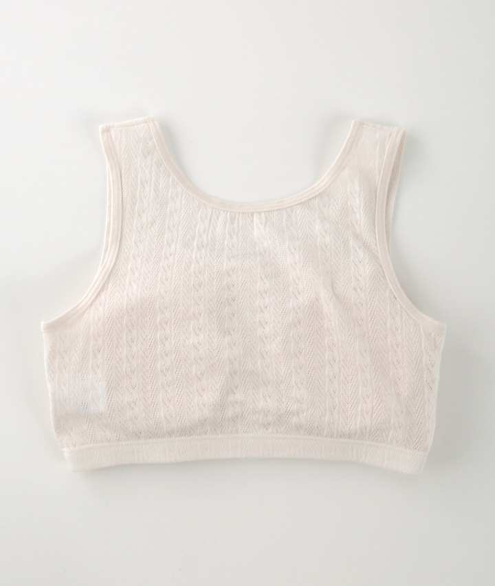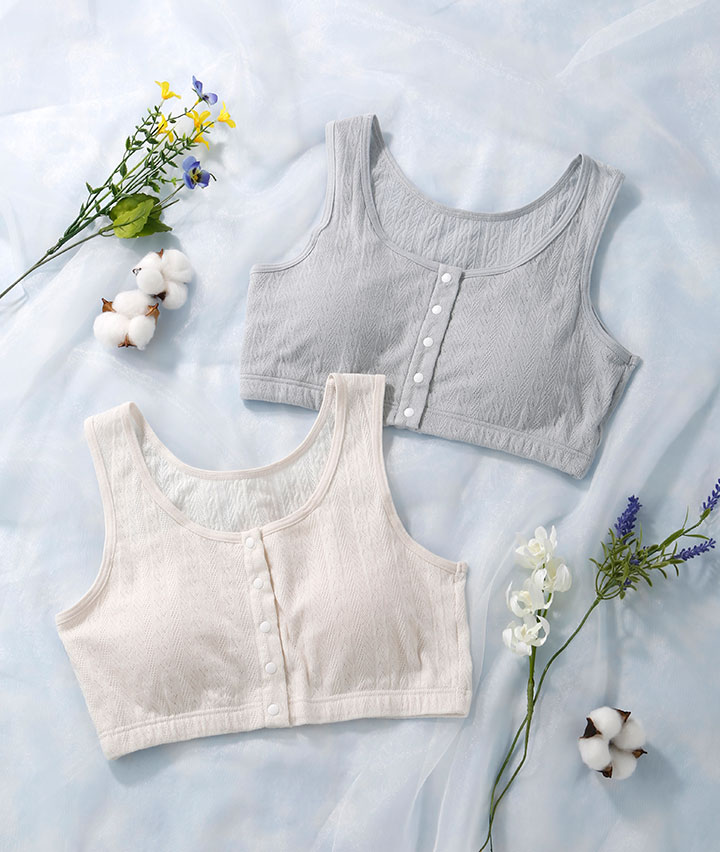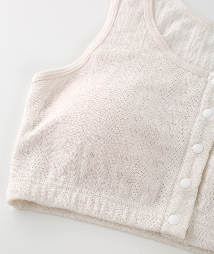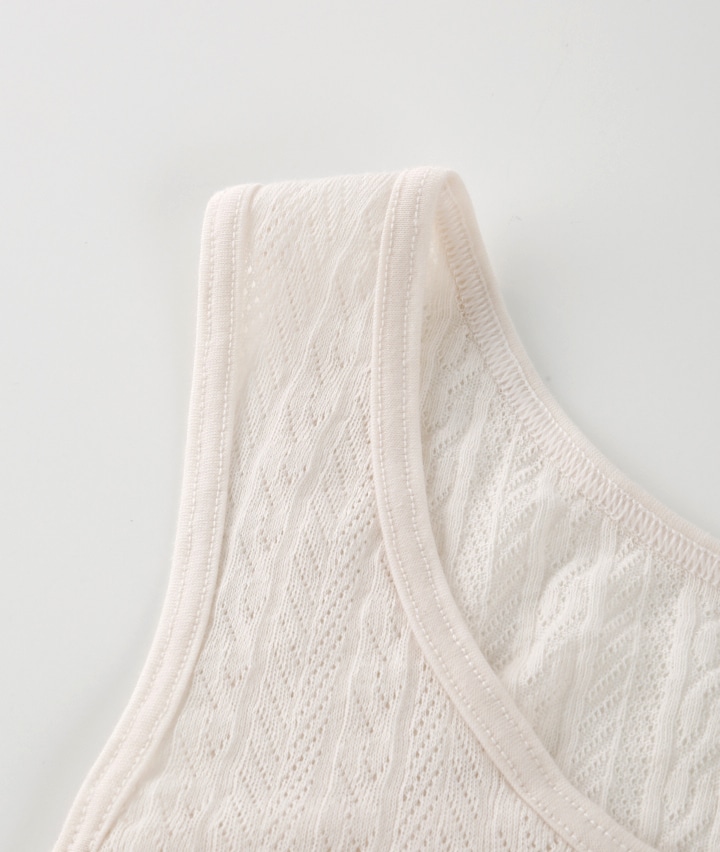・綿100%のメッシュ素材で、軽くてやさしい着心地のルームインナー。着脱しやすい前開き仕様。おうちでのリラックスタイムに。