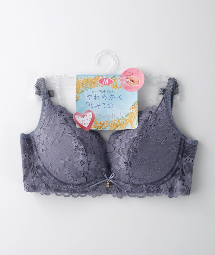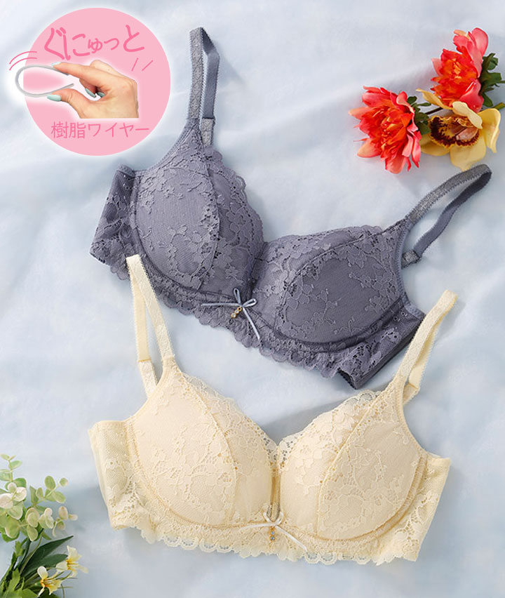 ・ぐにゅっと柔らか樹脂ワイヤー入りのブラジャー。ワイヤーブラよりも締め付け感無く、ノンワイヤーブラよりも程よく支える、良いとこどりで新感覚な着用感。カップ肌側はふにゅっと気持ちいいマイクロナイロン素材を使用し、バストをやわらかく包みこみます。