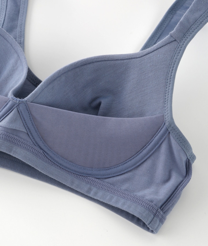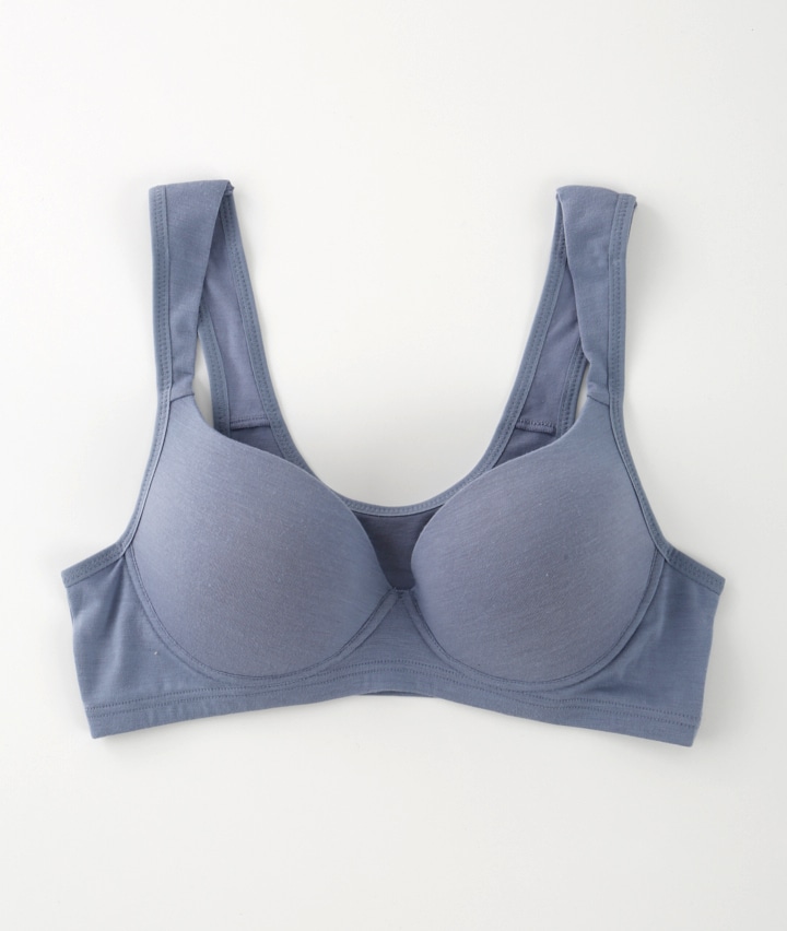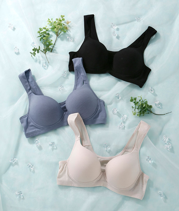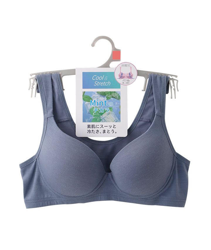 ・天然由来のミント加工&レーヨンMIXですっきり冷感。つるんとしたモールドカップでアウターにひびきにくい。内側パネルが自然な丸みの美胸をメイク。