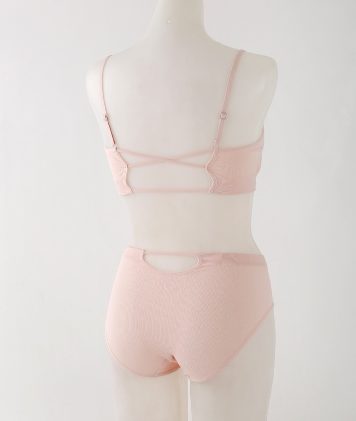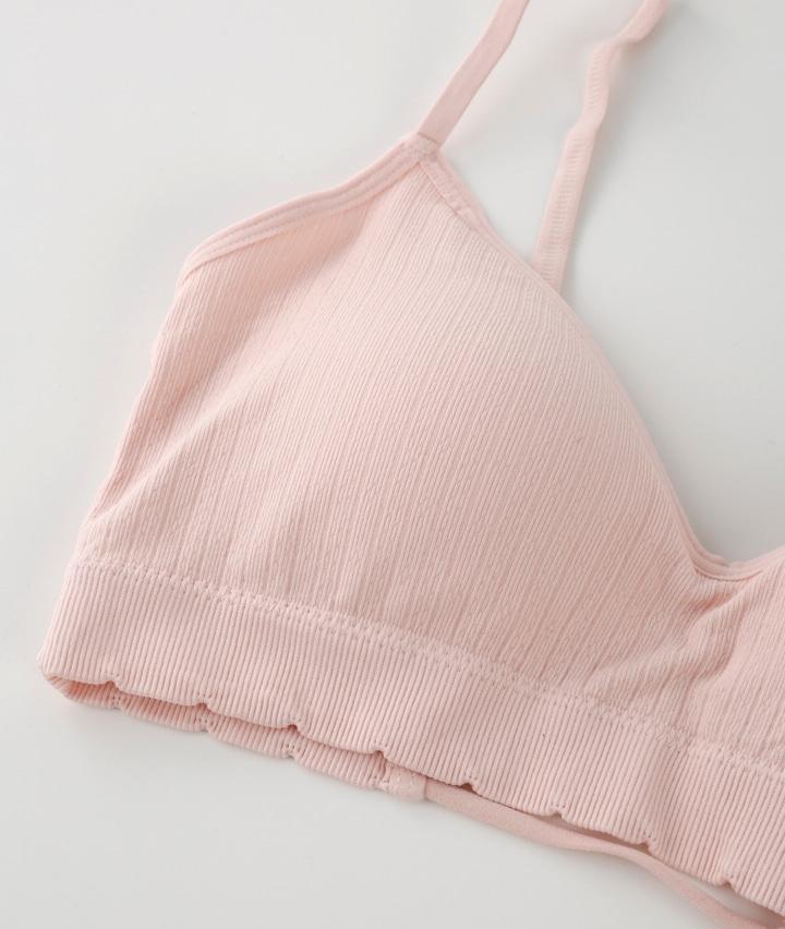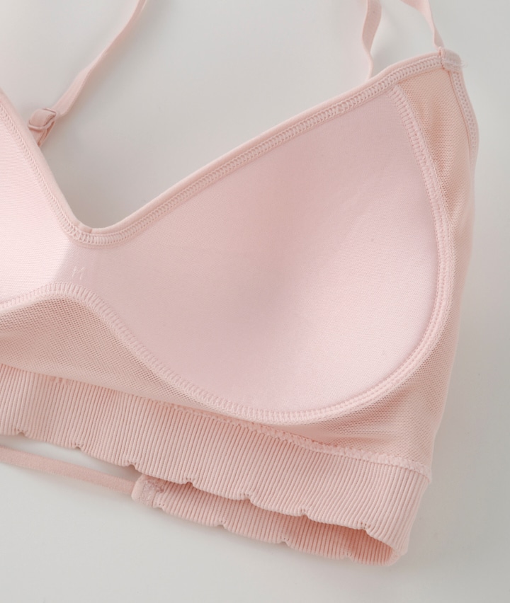 ・カラダに程よくフィットしてスタイルアップできる成型編み。下厚三角パッド入りでデコルテふっくらメイク&ズレにくくデイリー使いしやすい仕様。ノンワイヤーでラクな着け心地。背中クロスのストラップでバックスタイルも可愛く、見えても良いデザイン。