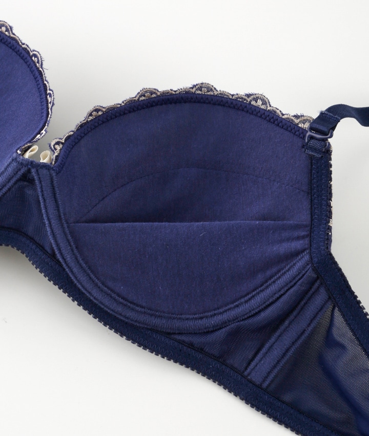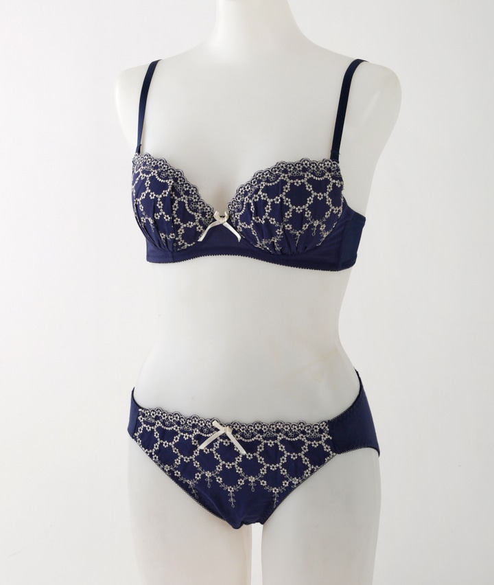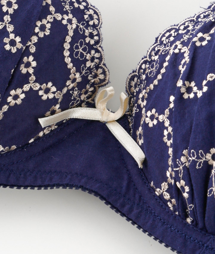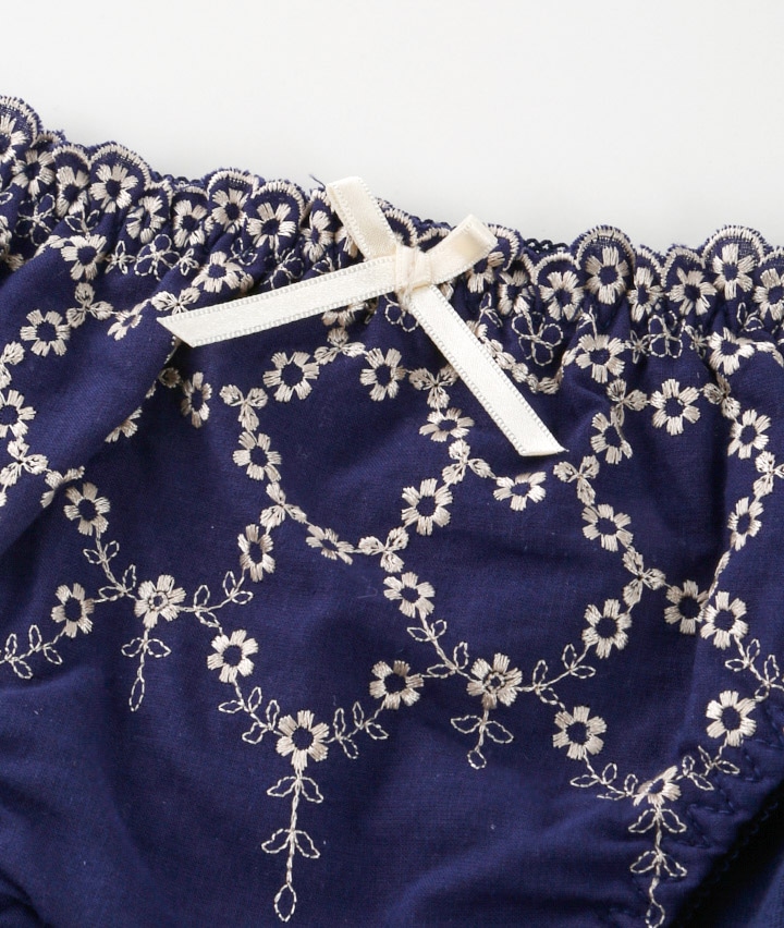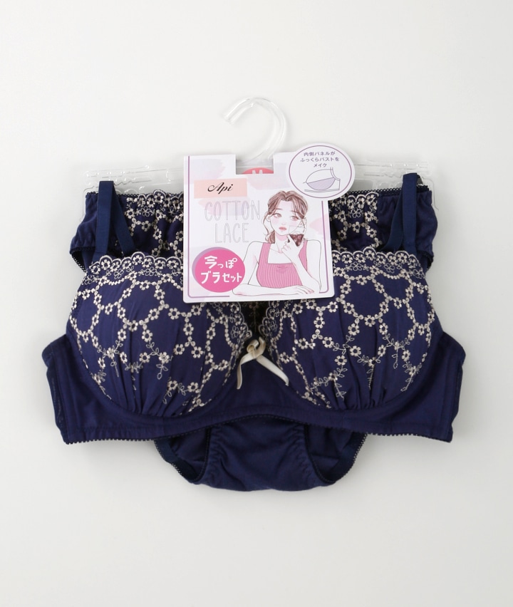 ・ガーリームード満点なふんわりかわいいコットンレースを使用。カップ裏には横流れを防止するパネル内蔵で自然な丸胸をメイク。ショーツは綿素材でお肌に優しいはき心地。