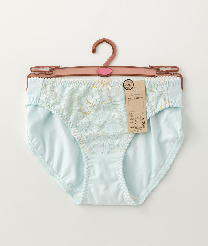 ・花柄プリントのレースがナチュラル可愛いショーツ。マチ部分アルガンオイル加工&コットンMIX素材でお肌に優しいはきごこち。