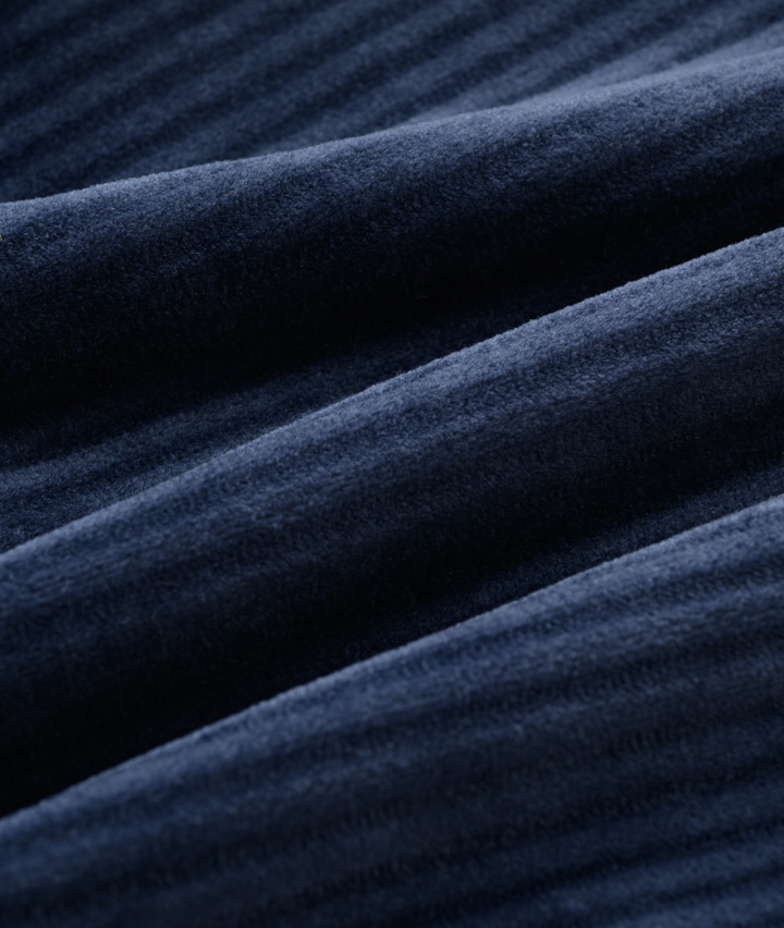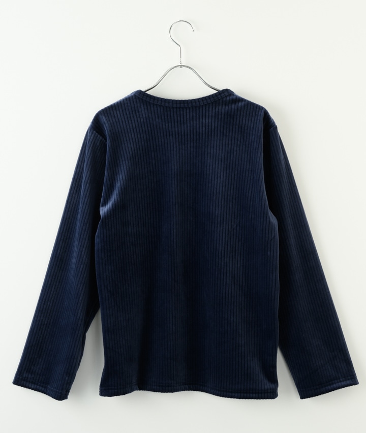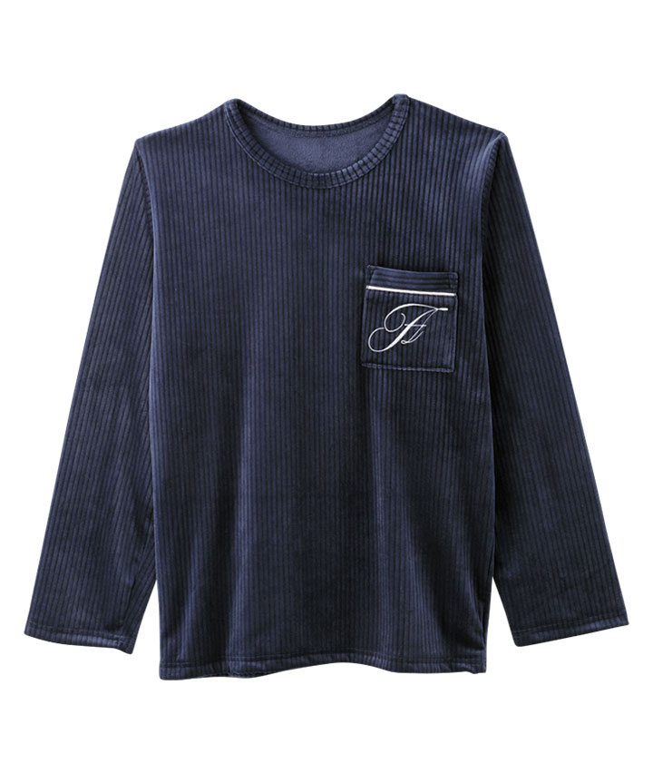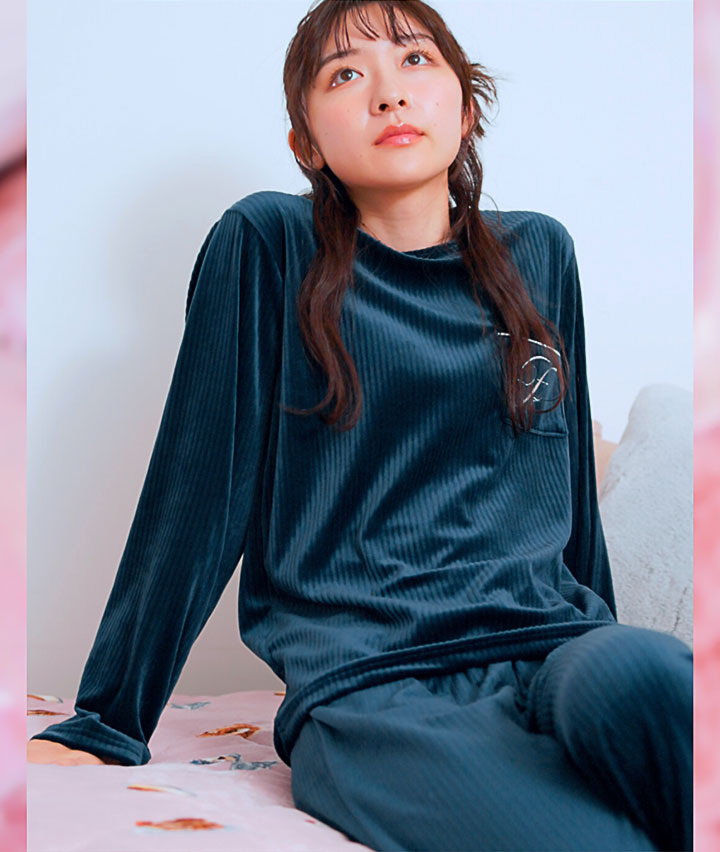 ・胸ポケット刺繍がポイントのルームウェア。やみつきタッチのふわとろベロア生地でずっと触れていたい心地よさ♪同シリーズのロングパンツとコーディネイトするのがおすすめ。