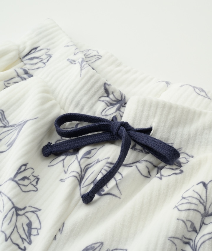 ・フェミニンで大人かわいいフラワー柄と太めシルエットがポイントのルームパンツ。やみつきタッチのふわとろベロア生地でずっと触れていたい心地よさ♪同シリーズのトップスとコーディネイトするのがおすすめ。