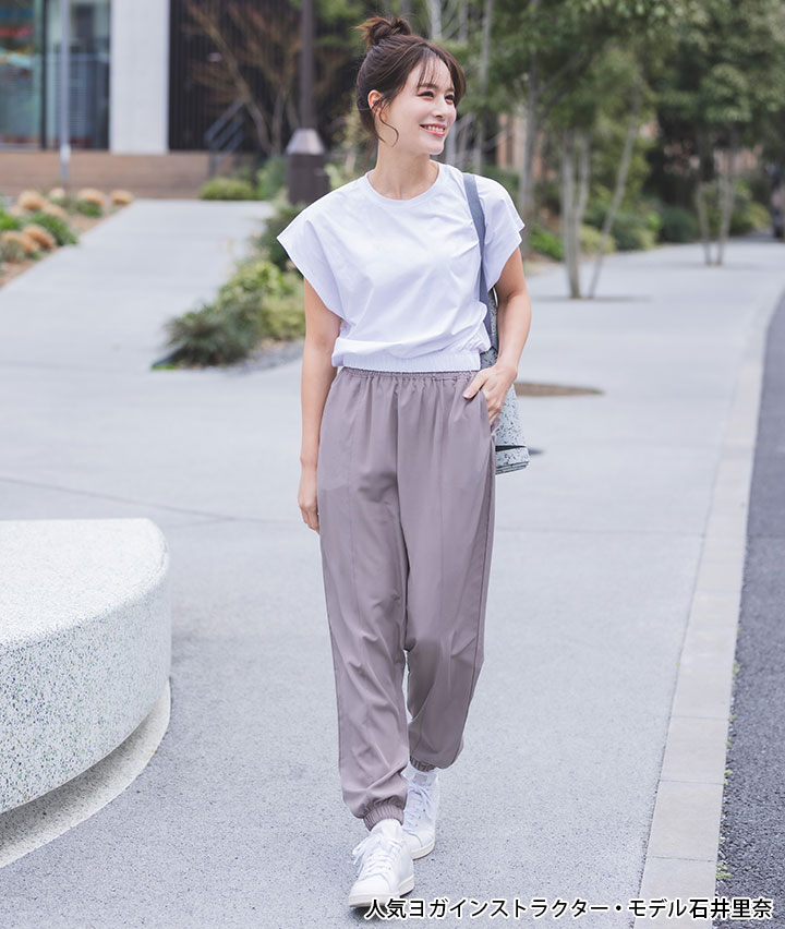 ・ゆったりとしたシルエットで動きやすいジョガーパンツ。便利なポケット付き。ヨガやエクササイズはもちろん、普段使いもしやすいアイテム。