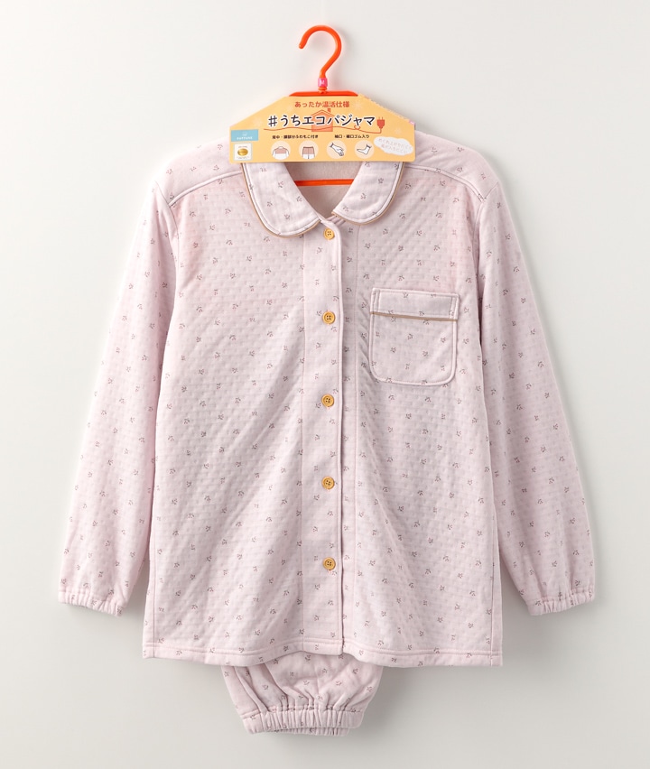 ・温活あったかシャツパジャマ。背当て、腰当て部分はふわもこ生地を使用し、袖口とパンツ裾口がゴム仕様になっている暖かパジャマです。
