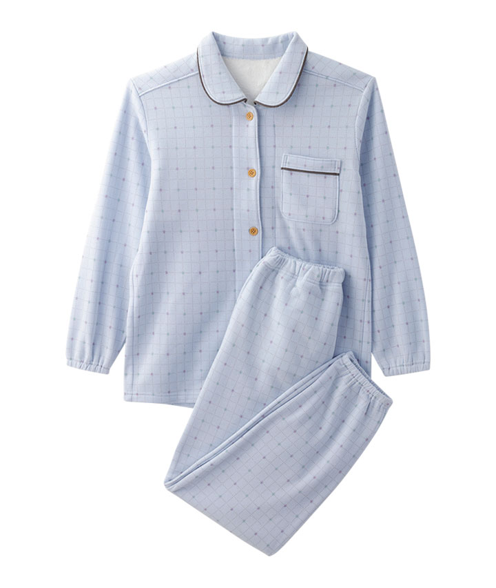 ・温活裏起毛あったかシャツパジャマ。背当て、腰当て部分はふわもこ生地を使用し、袖口とパンツ裾口がゴム仕様になっている暖かパジャマです。