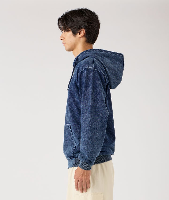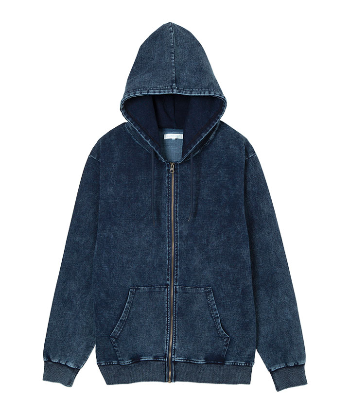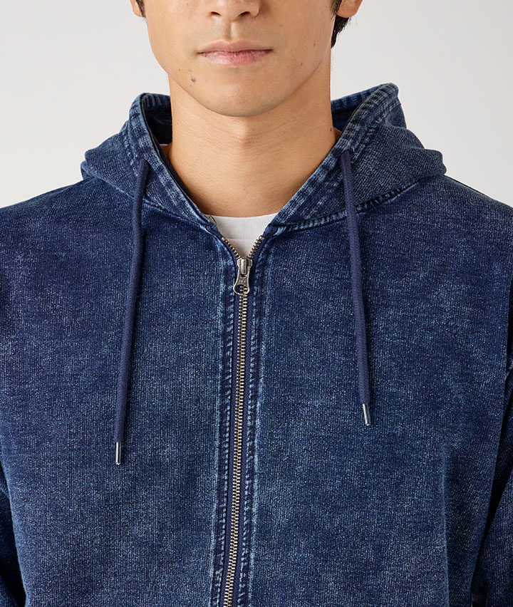 ・カットデニムの素材にケミカル加工を加えたジップパーカータイプ。