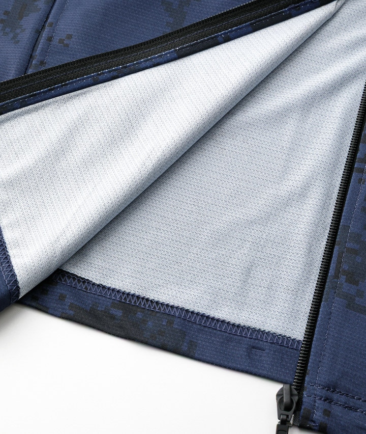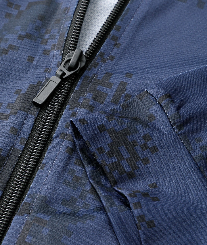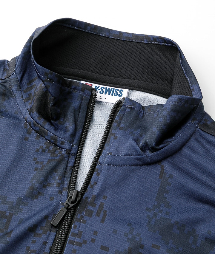 ・UV加工を施した、<K・SWISS>ブランドの迷彩柄スタンドジャケット。※吸汗・速乾・消臭機能素材を使用。