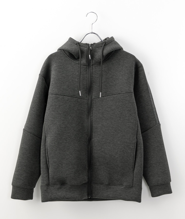 ・まるでスポンジのような触感が新しいスウェットパーカ。滑らかな肌触り。さりげなく肩から腕にかけて同色ラインが入っているのもポイント!