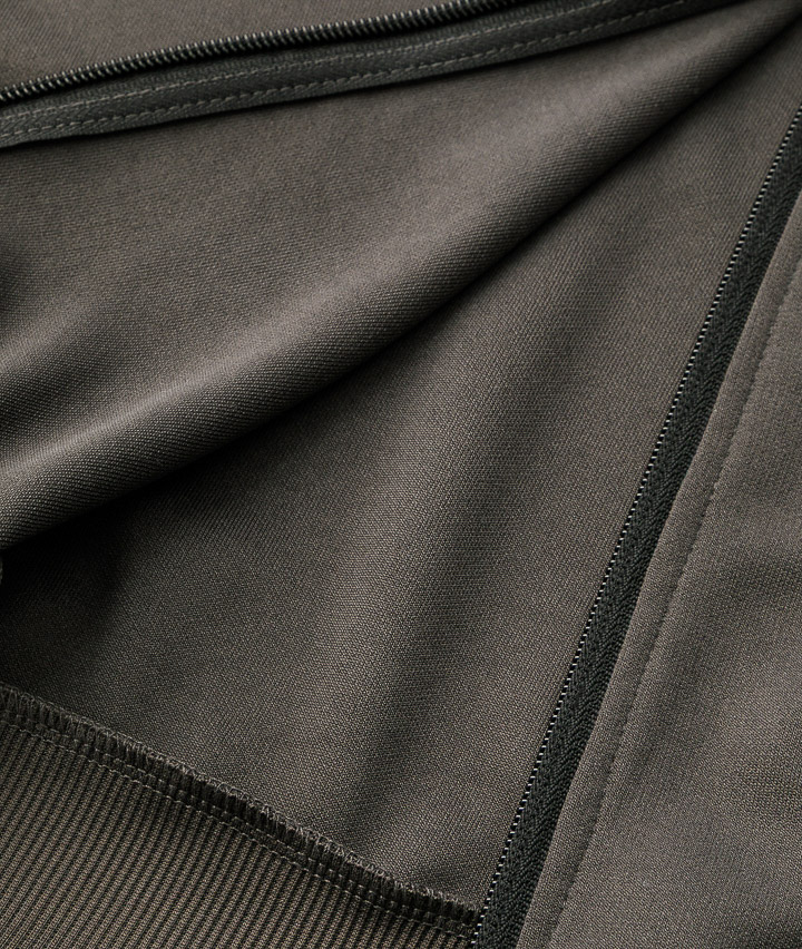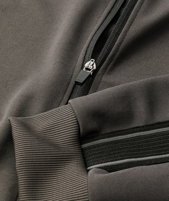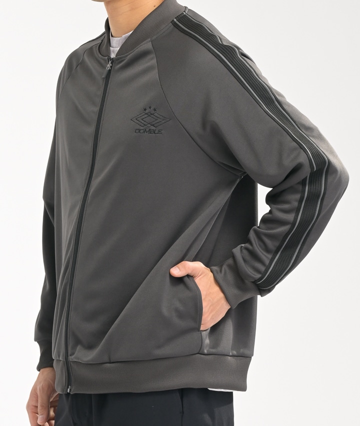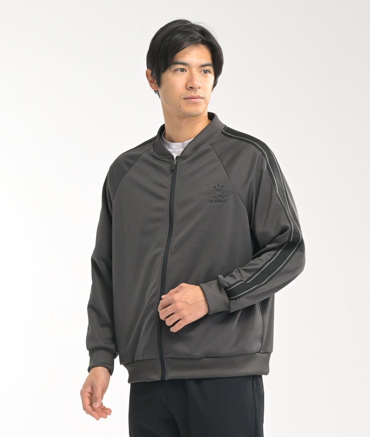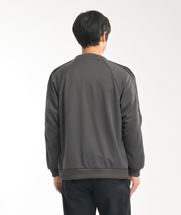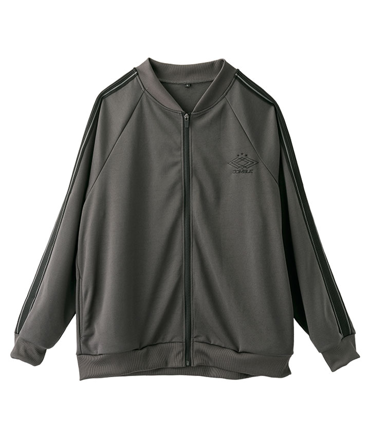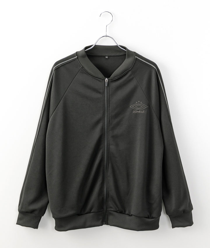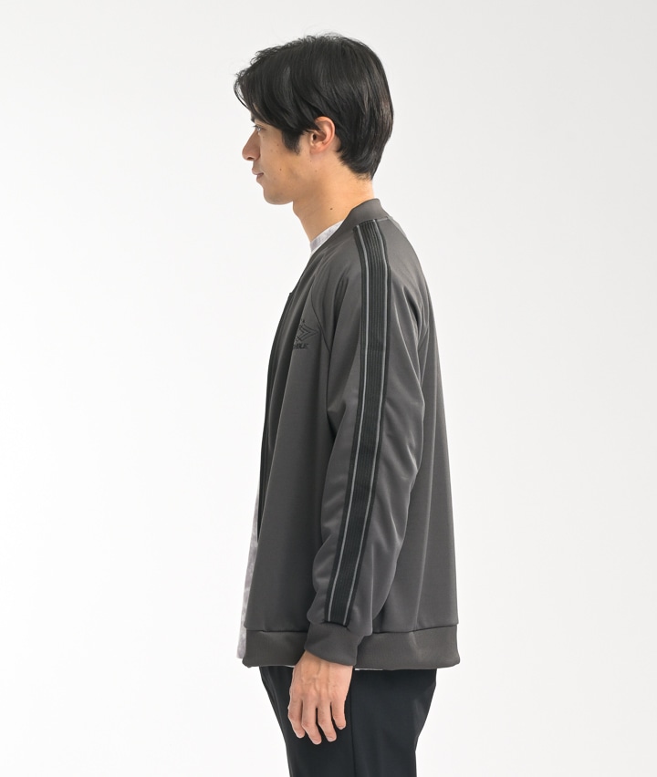 ・モノトーンなトラックジャケットは、MA-1風のリブブルゾンタイプ。肩から袖にかけてモノトーンのラインテープ使いでエッジの効いたデザインになってます。