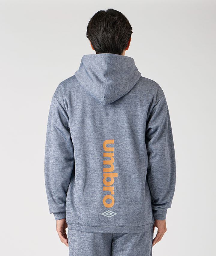 ・UMBROのフルジップパーカーです。カチオン杢の生地にバックプリントのロゴがポイントです。裏地は裏起毛であたたかい機能があります。