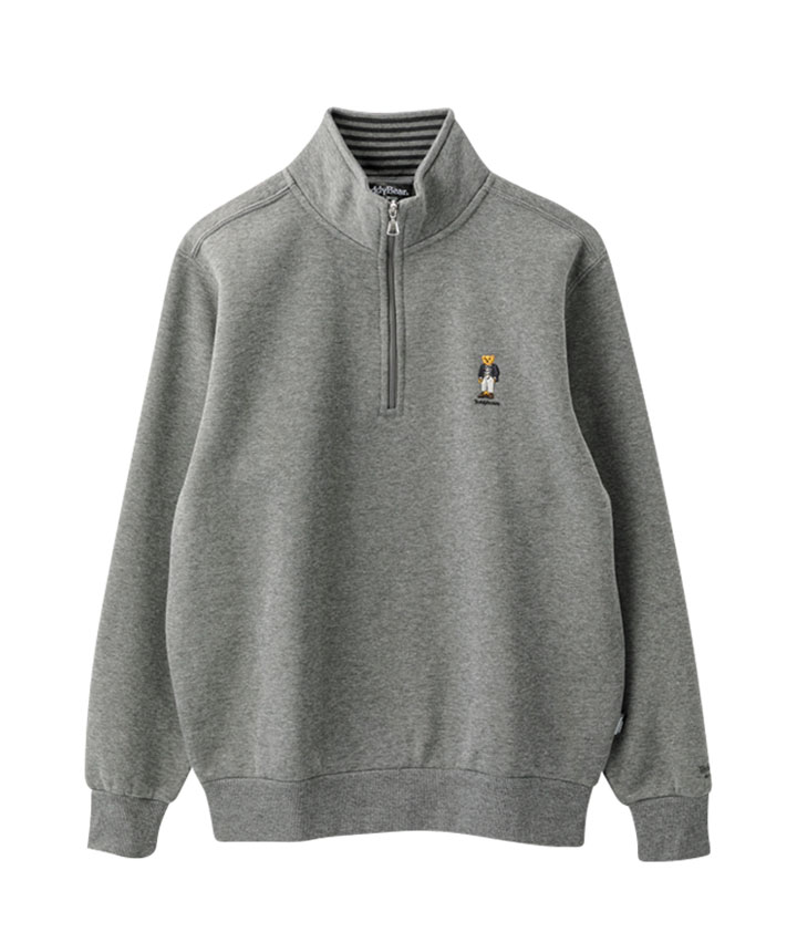 ・テディーベアーのワンポイント刺繍を施した裏起毛ハーフジップトレーナー。 ベーシックな3色展開でコーディネートしやすいアイテムです、