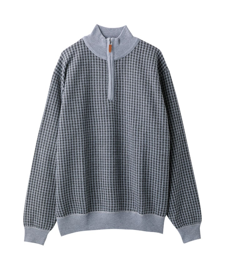 ・ジャガード柄の裏シャギーをボンディングしたハーフジップニット。 落ち着いた千鳥格子柄で合わせやすく、裏生地がシャギーでとても肌触りもよく風を通しにくいのでちょっとしたお出かけにも温かくて最適です。