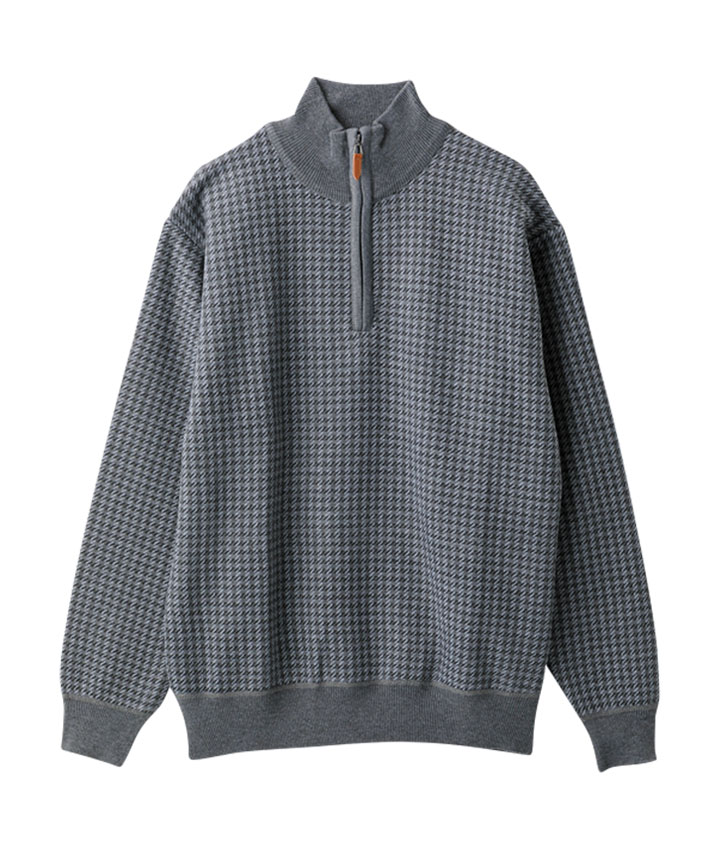 ・ジャガード柄の裏シャギーをボンディングしたハーフジップニット。 落ち着いた千鳥格子柄で合わせやすく、裏生地がシャギーでとても肌触りもよく風を通しにくいのでちょっとしたお出かけにも温かくて最適です。