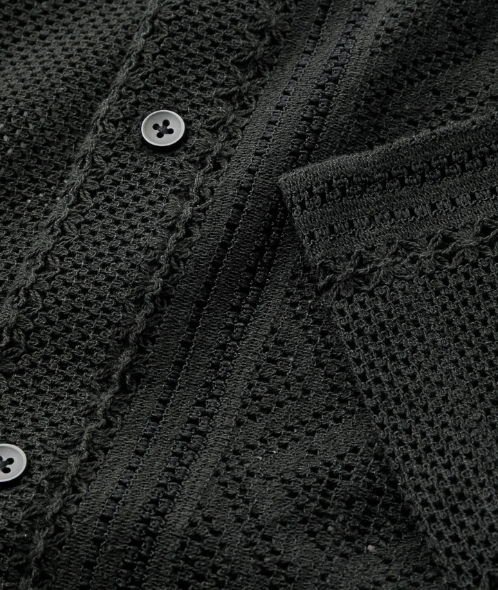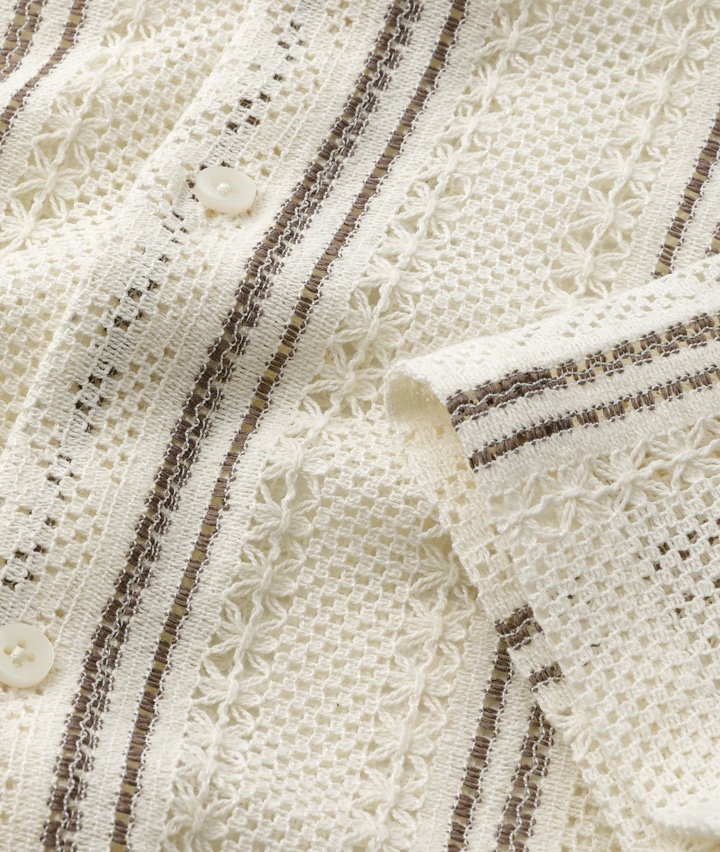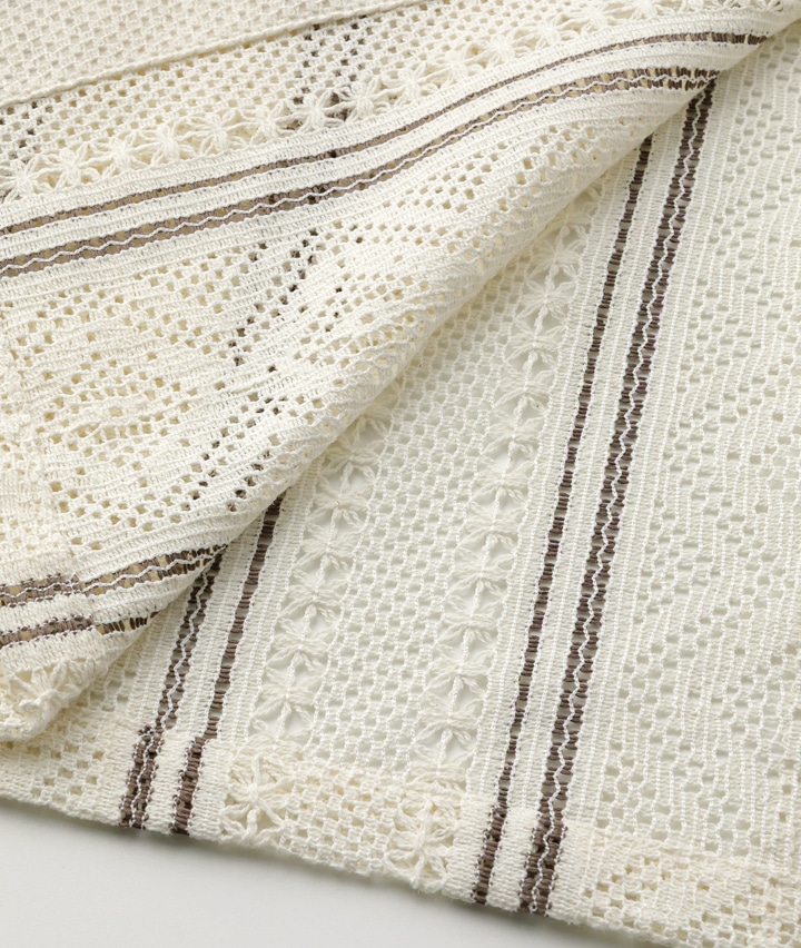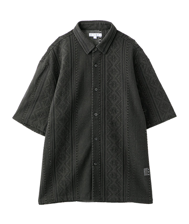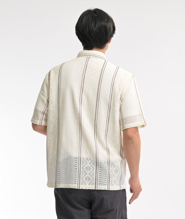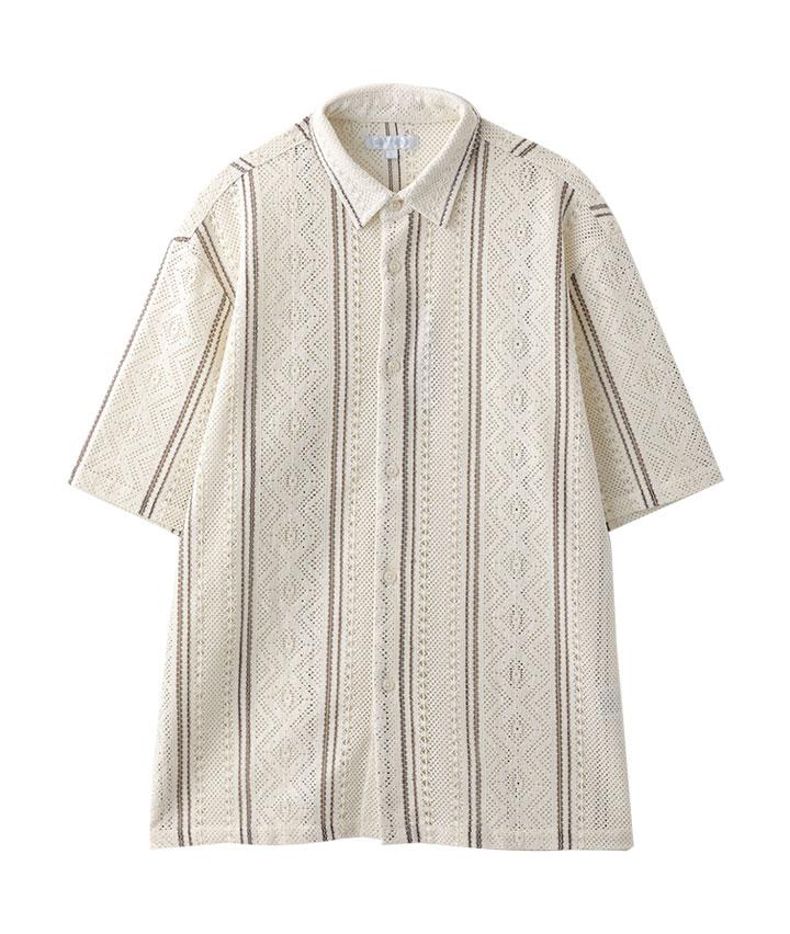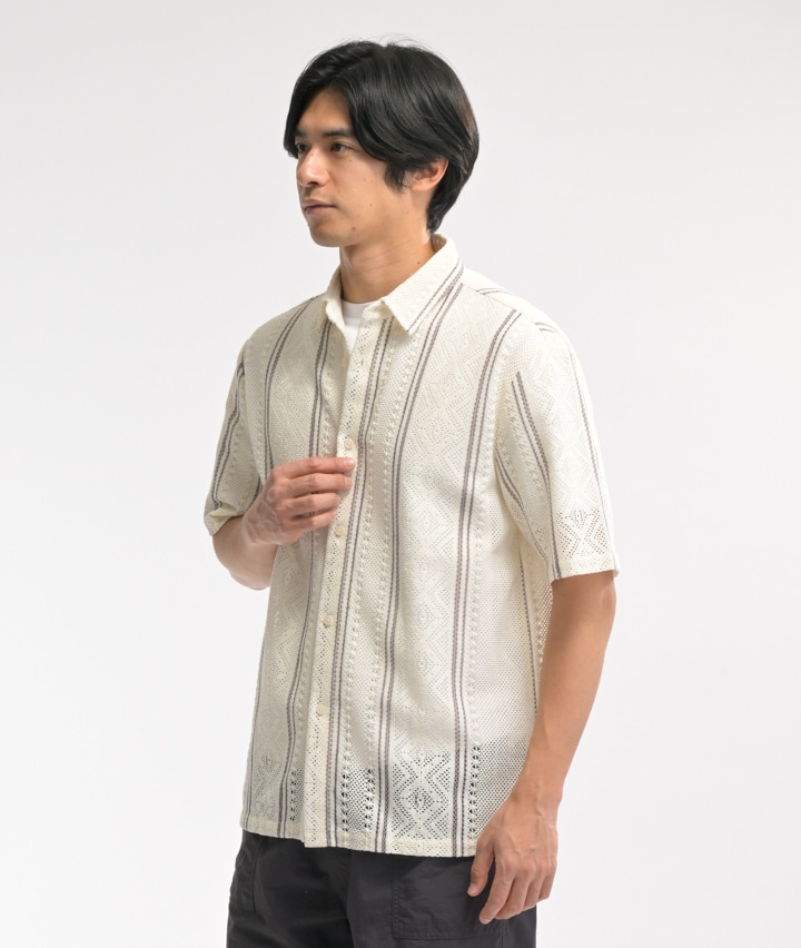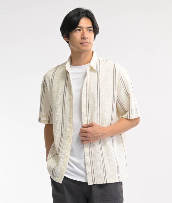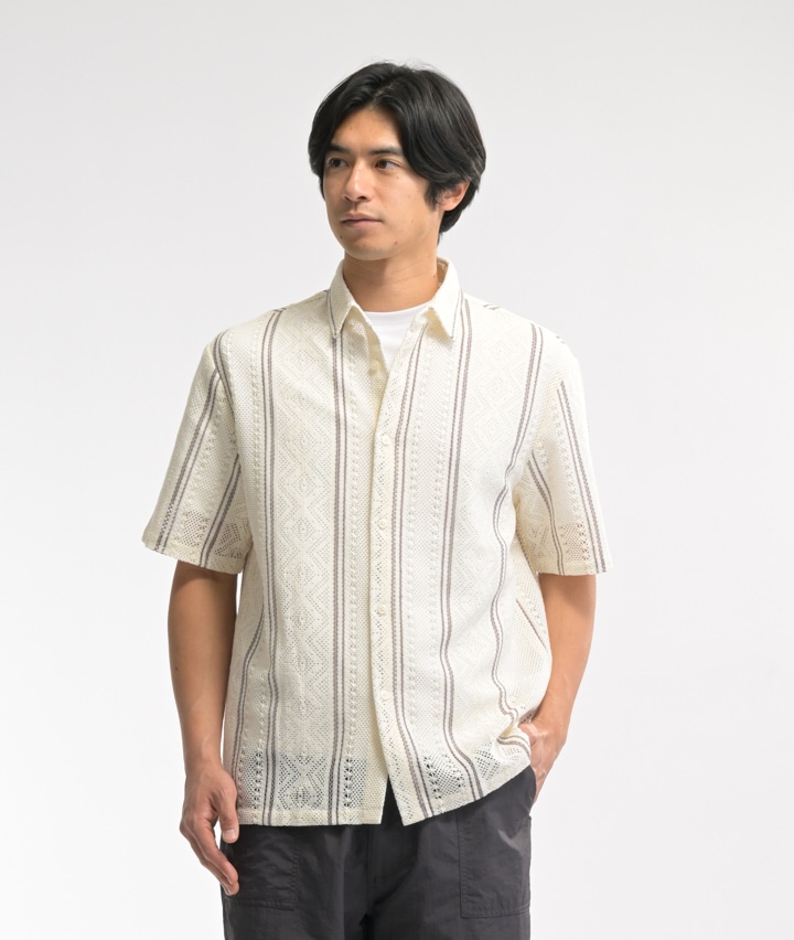・さらさらとしたストライプ柄のレース素材を使用した半袖シャツです。ゆったりとしたサイズ感とレースの軽い着心地が涼しげです。レース生地は通気性も良く、暑い時期にもおススメです。