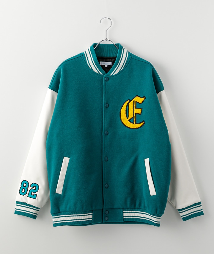 ・オーバーサイズシルエットのスタジャンです。胸や袖に配置した刺繍やサガラ刺繍がデザインポイントです。ボディーはメルトン風生地、袖は合皮などを使用し、中綿をキルトしてあり細部にまでこだわった仕上がりです。