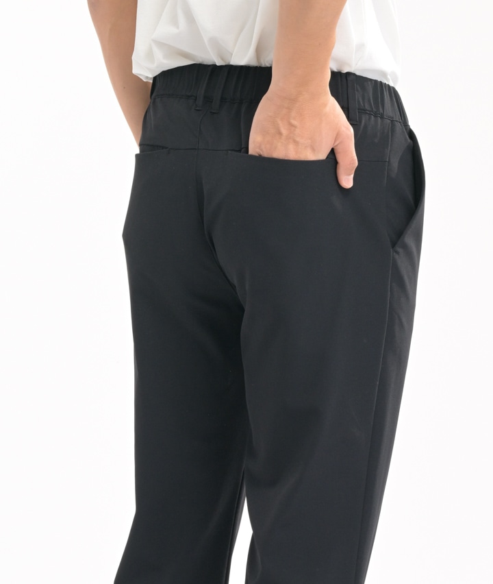 ・ストレッチ入りで良く伸びるので非常に履きやすいのがポイントのジョガーパンツです。細身のシルエットで履きやすいです。撥水・防汚機能も付いてるのも普段使いにはうれしい。同素材のシルエット違いのワイドフィットテーパードパンツタイプもございます。