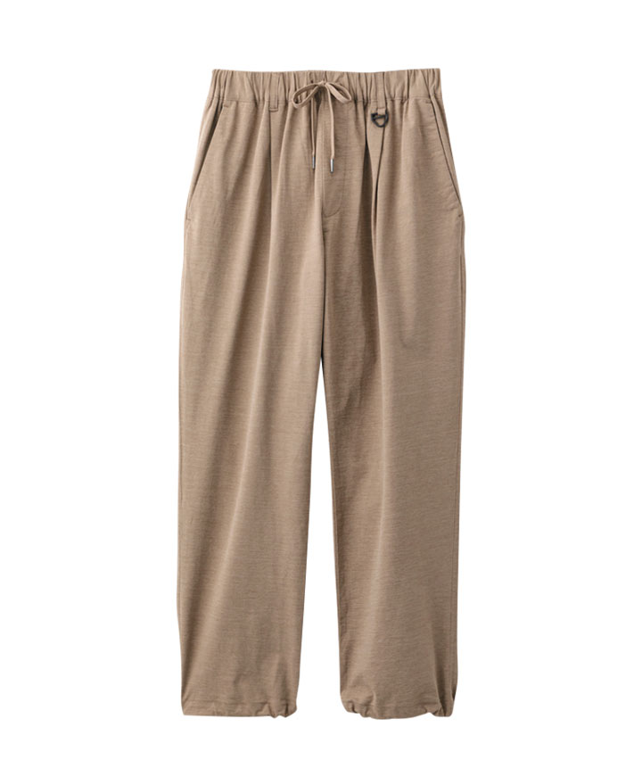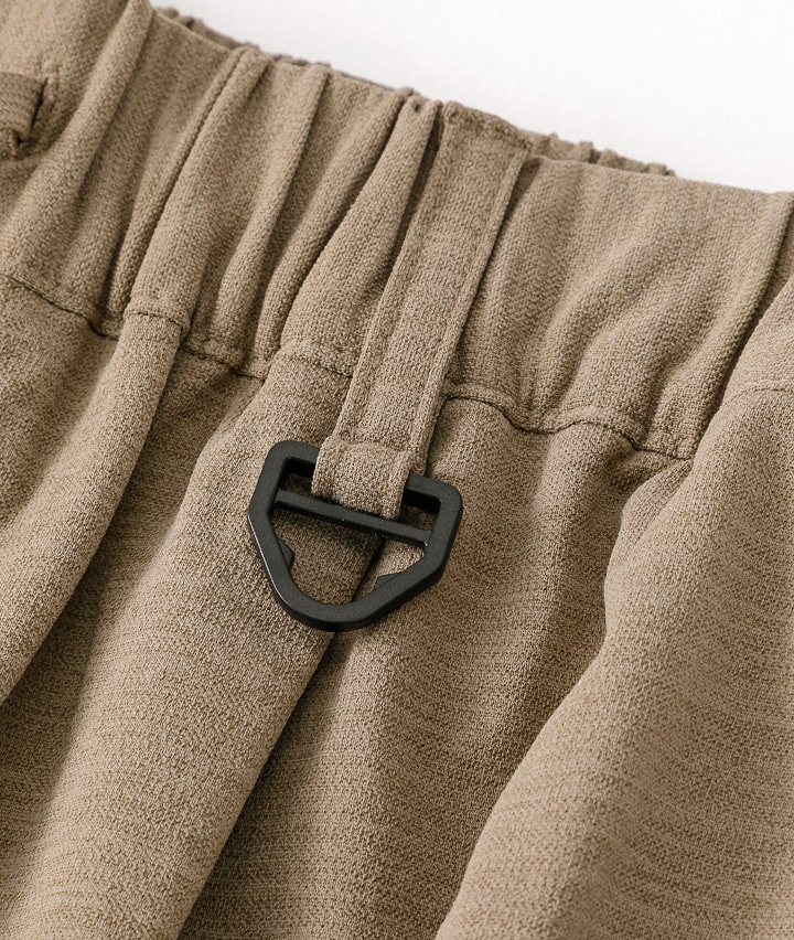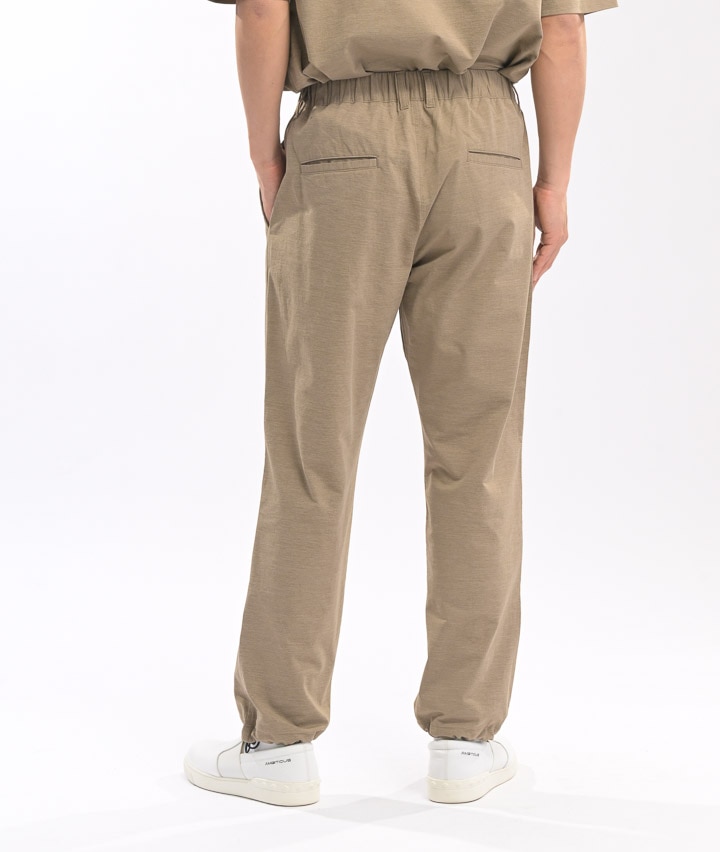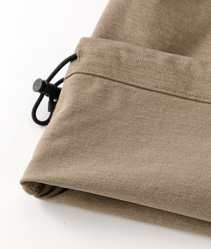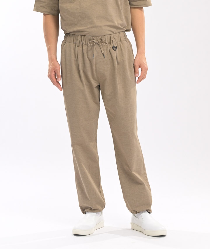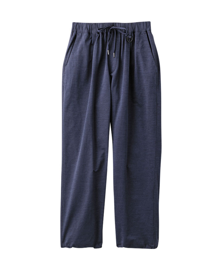 ・ややワイドシルエットのパンツは、ウェストが紐で縛れるイージーパンツ仕様。やや引き揃え杢調の生地が特徴。裾がスピンドル使いで、それを絞ることで違ったシルエットを楽しめます。同素材のビッグフラップシャツ・ワイドシルエットTシャツを合わせてセットアップで着用するのがトレンド!冷感・速乾・イージーケア・UVカット機能付き。360°ストレッチなので良く伸びて着用しやすい。