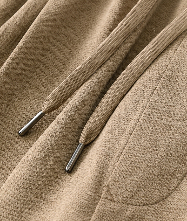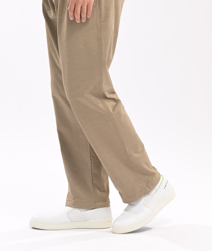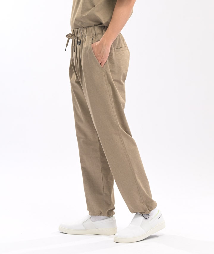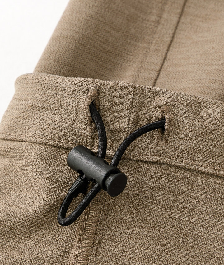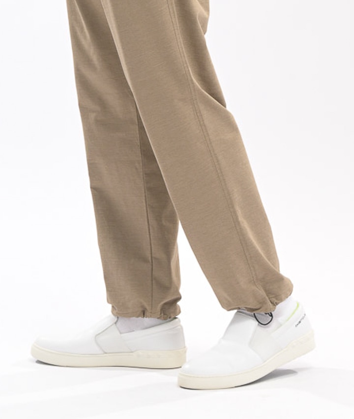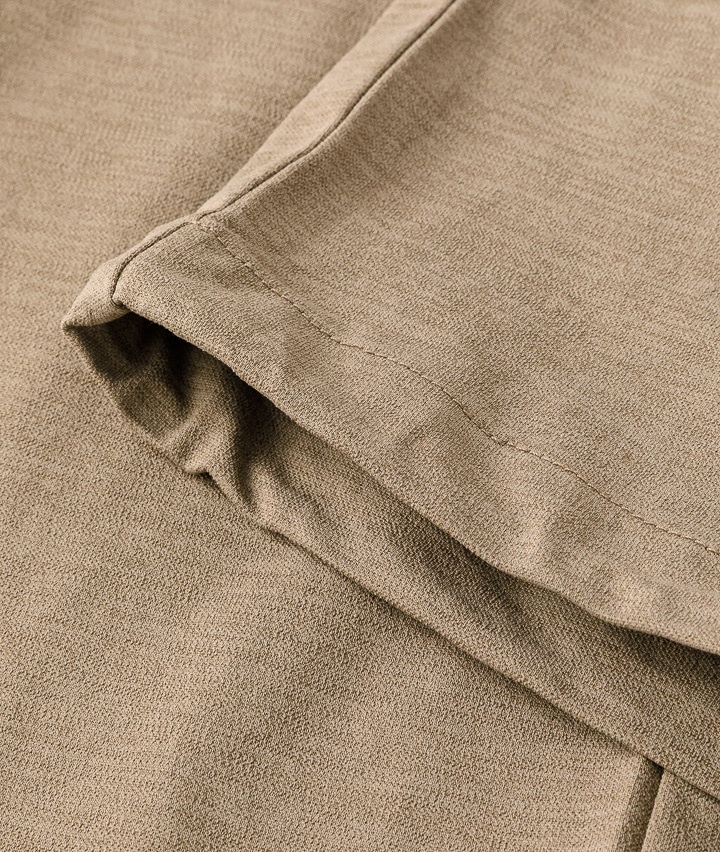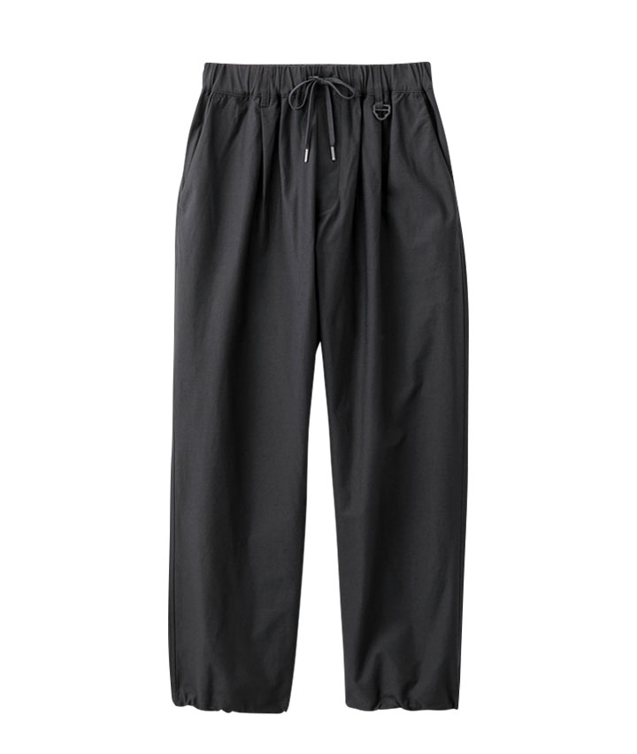 ・ややワイドシルエットのパンツは、ウェストが紐で縛れるイージーパンツ仕様。やや引き揃え杢調の生地が特徴。裾がスピンドル使いで、それを絞ることで違ったシルエットを楽しめます。同素材のビッグフラップシャツ・ワイドシルエットTシャツを合わせてセットアップで着用するのがトレンド!冷感・速乾・イージーケア・UVカット機能付き。360°ストレッチなので良く伸びて着用しやすい。