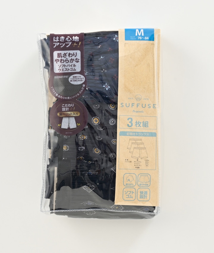 ・※前開き商品です。肌側にソフトパイルウエストゴムを使用し肌ざわりやわらか。綿100%の3枚組トランクスです。※総柄の商品は、生地の裁断箇所によって商品一点ごとにパターン(柄)が異なっているものがございます。そういった商品の場合、お届けした商品が掲載画像とはパターンの位置や内容が異なるものがあります。予めご了承の上、ご購入をお願い致します。