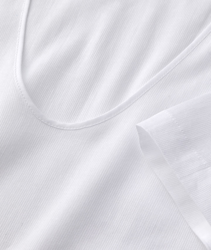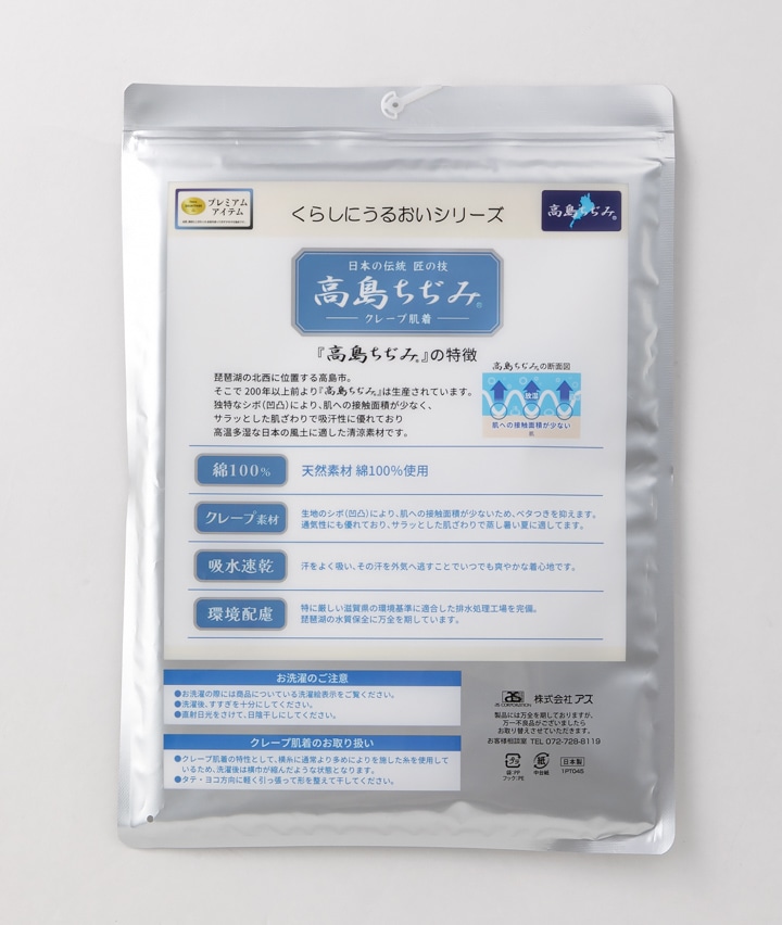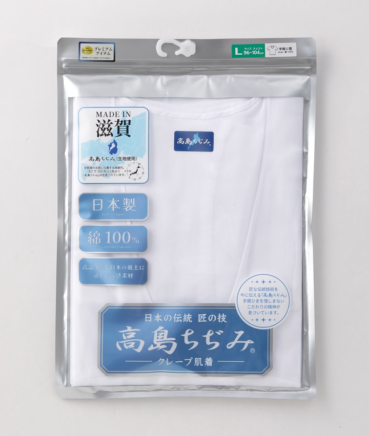 ・匠な伝統技術を今に伝える【高島ちぢみ】の生地を使用したプレミアムなクレープ肌着。琵琶湖の北西に位置する高島市で200年以上前より生産されています。独特なシボ(凹凸)により肌への接触面積が少ないため、サラッとした肌ざわりです。吸汗性に優れており高温多湿な日本の風土に適した清涼素材です。手間ひまを惜しまないこだわりの精神が息づいた逸品です。