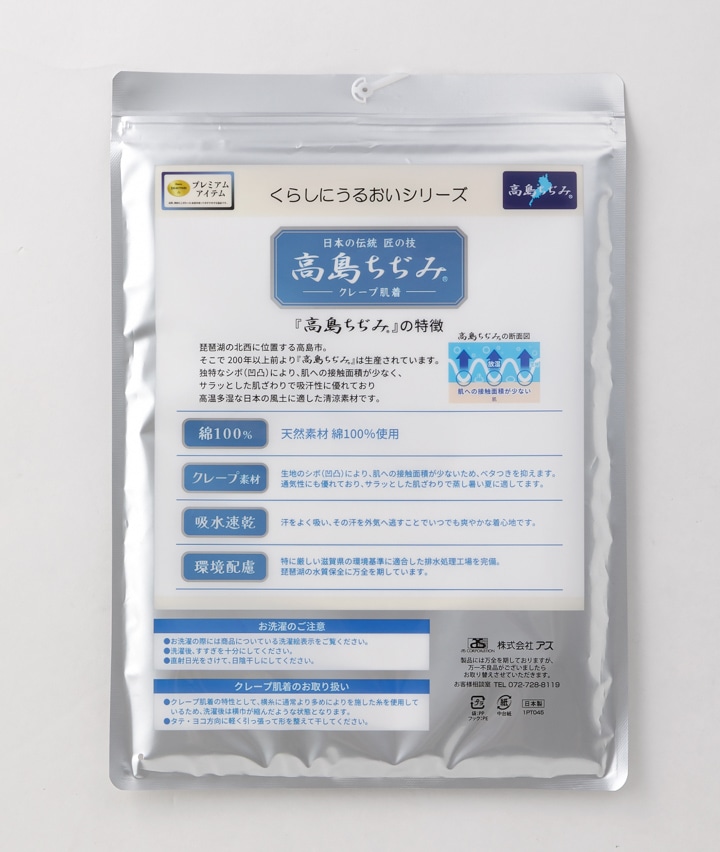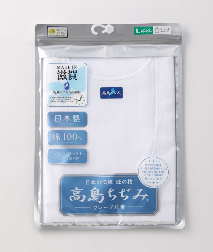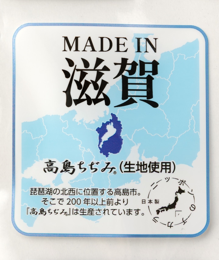 ・匠な伝統技術を今に伝える【高島ちぢみ】の生地を使用したプレミアムなクレープ肌着。琵琶湖の北西に位置する高島市で200年以上前より生産されています。独特なシボ(凹凸)により肌への接触面積が少ないため、サラッとした肌ざわりです。吸汗性に優れており高温多湿な日本の風土に適した清涼素材です。手間ひまを惜しまないこだわりの精神が息づいた逸品です。