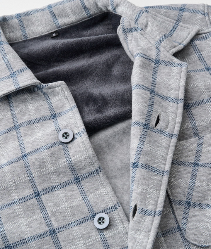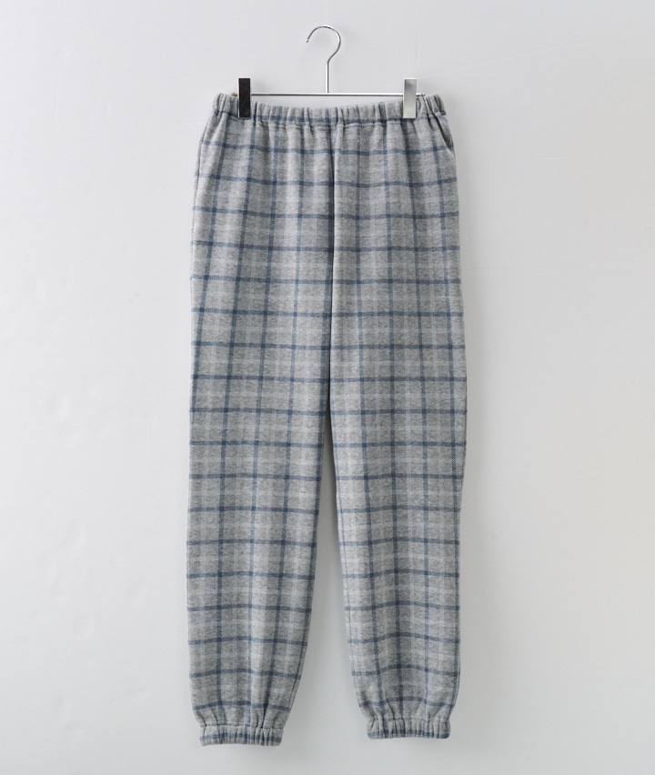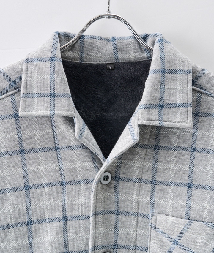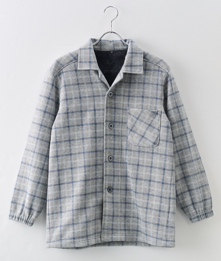 ・温活裏起毛あったかシャツパジャマ。背当て、腰当て部分はふわもこ生地を使用し、袖口とパンツ裾口がゴム仕様になっている暖かパジャマです。