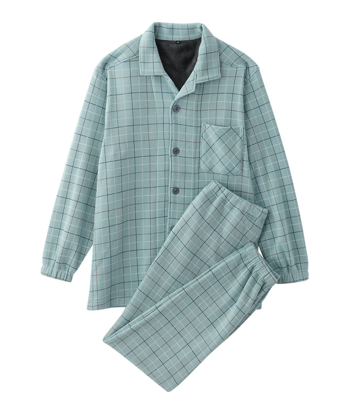 ・温活裏起毛あったかシャツパジャマ。背当て、腰当て部分はふわもこ生地を使用し、袖口とパンツ裾口がゴム仕様になっている暖かパジャマです。