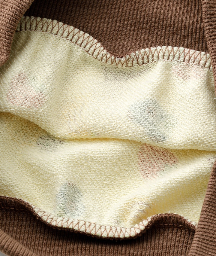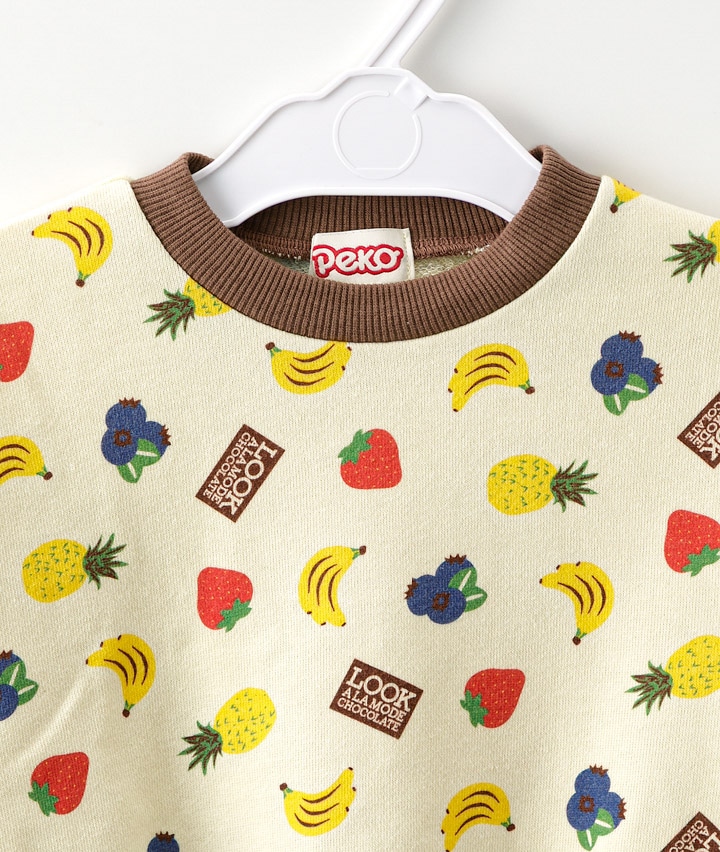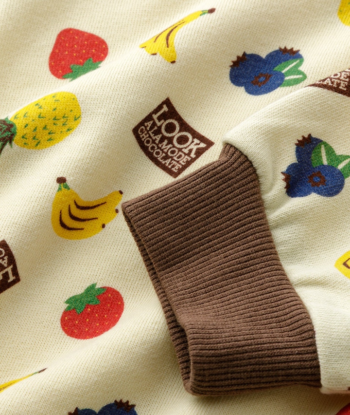 ・不二家のルックチョコレートの総柄プリントが可愛いトレーナーです。 チョコレート色の衿、裾、袖口の配色もポイントです。