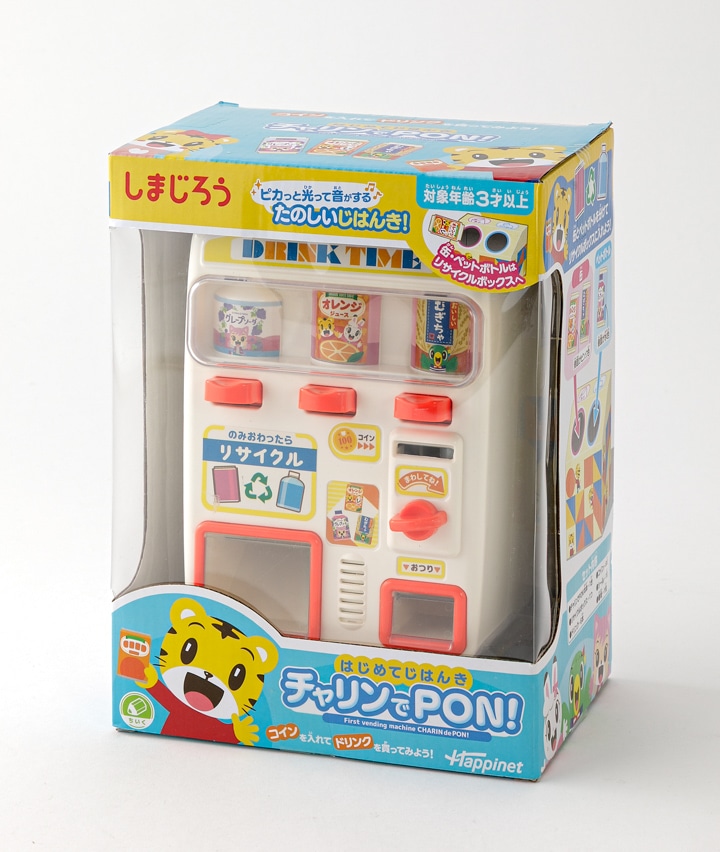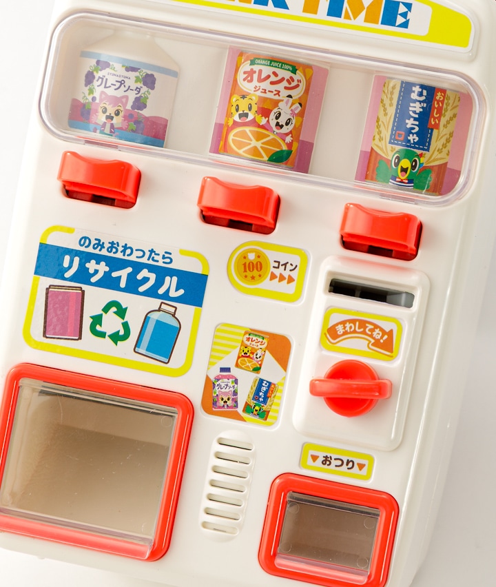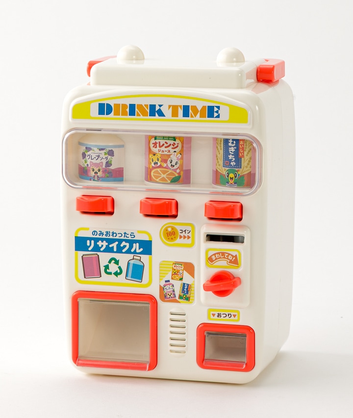 ・コインをいれて、ドリンクが買える“じはんき体験”ができるアイテムです。\nリサイクルボックスつきなので、缶とペットボトルの仕分けを遊びながら学べます。\n何度も遊びたくなるようドリンクを買うたびに曲が流れるよう工夫しています。