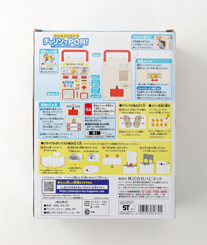 ・【セット内容】\n・本体×1\n・コイン×8\n・ドリンク×6\n・リサイクルボックス×1\n・シール×1\n・看板×1\n\n本体 ABS、PPS、PP\nドリンク・コイン ABS、PP\n看板、リサイクルボックス PP\n本体サイズ:W135×H205×D100mm\n使用電池:単3電池×2(別売り)