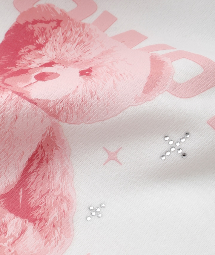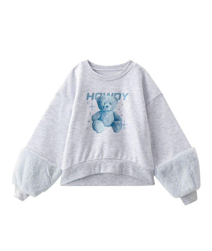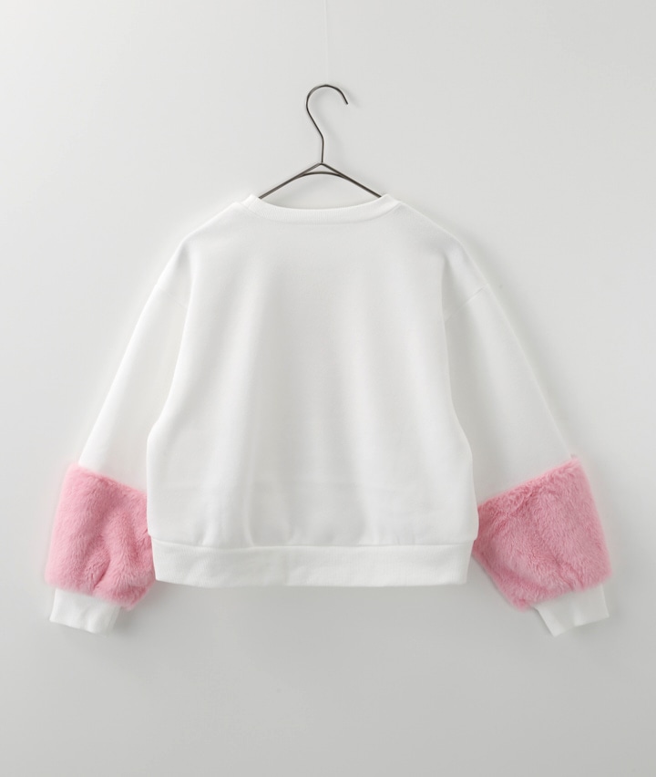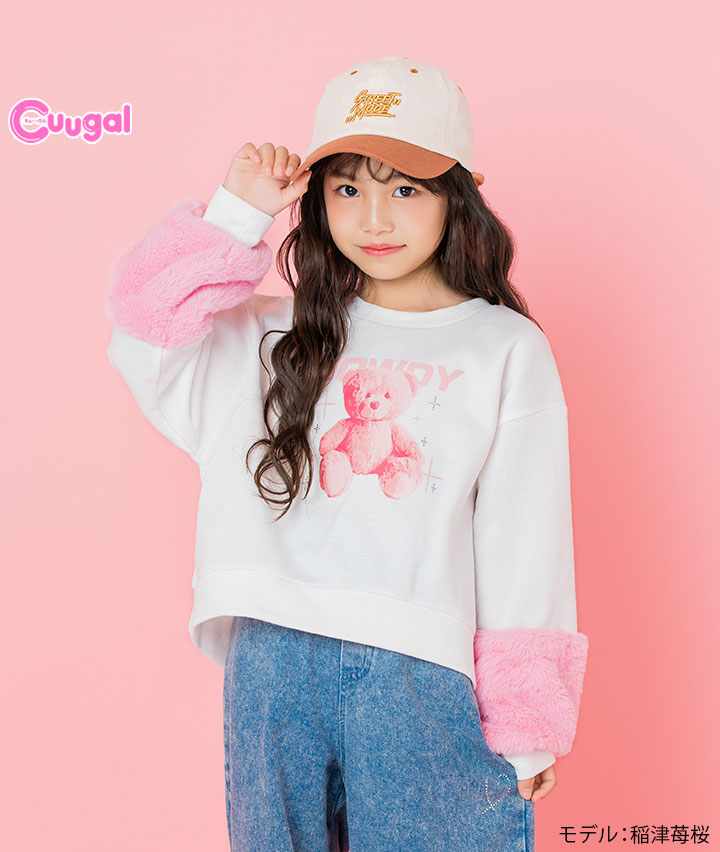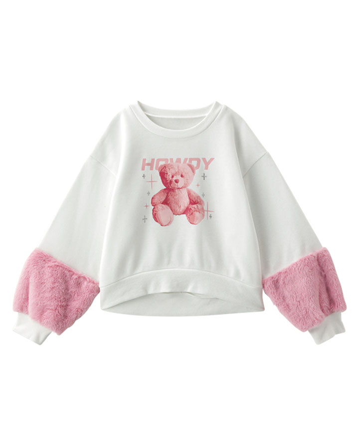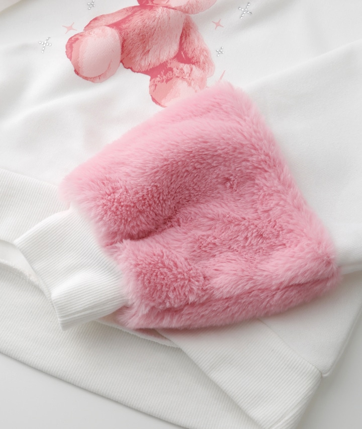 ・袖のファー切替がかわいいプルオーバーです。前身のくまの転写プリントにキラキラのラインストーンかかわいい!裏起毛素材で暖かいです。
