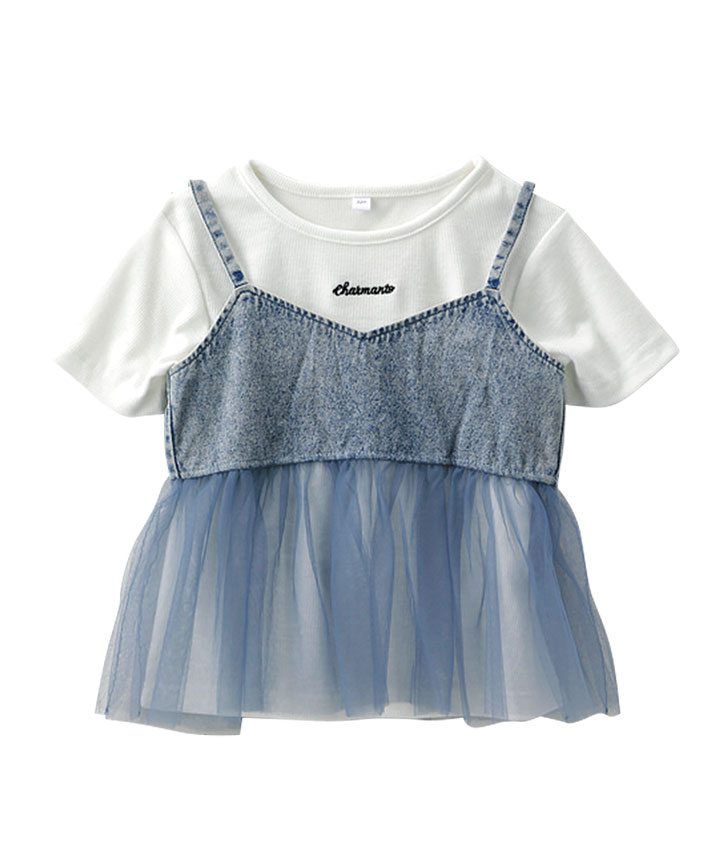 ・裾の透け感がかわいいデニムビスチェのアンサンブルです。
