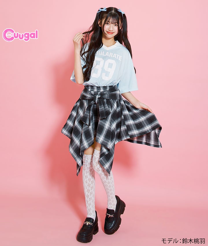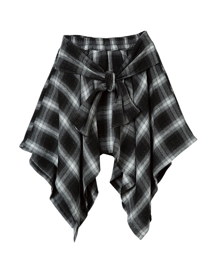 ・チェックシャツを巻いた風のデザインのスカートです。裏地はパンツ仕様でアクティブに動いても安心です。