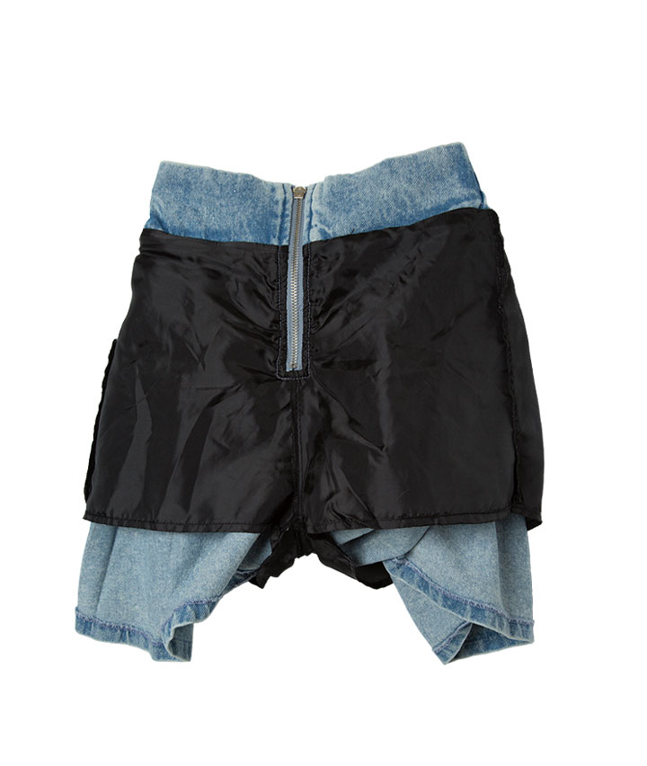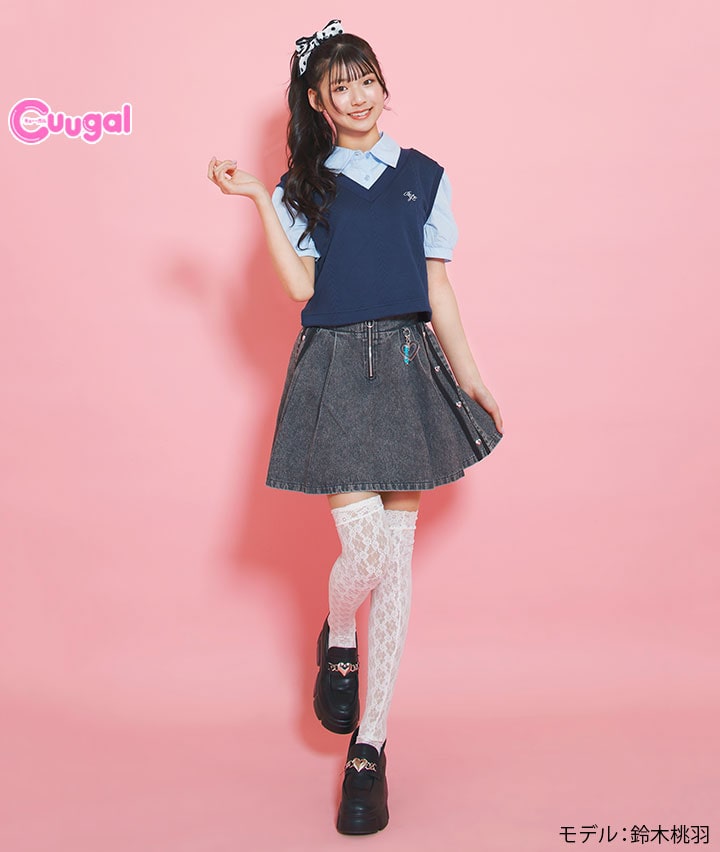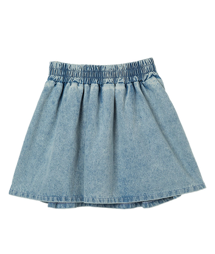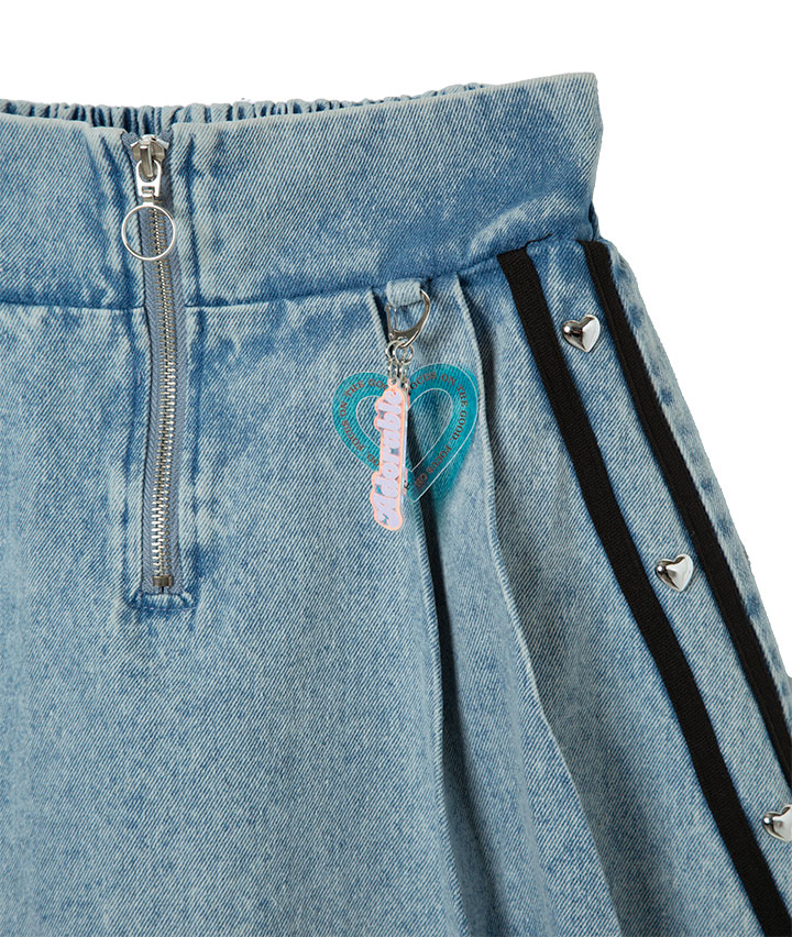 ・サイドラインとハートのスタッズがポイントのデニムプリーツスカートです。裏地はパンツ仕様でアクティブに動いても安心です。