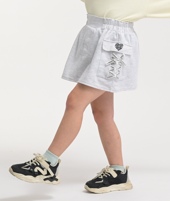 ・カーゴポケットのレースアップリボンが目を引く、やわらかいカットソー素材のスカートです。パンツ仕様に裏地付きでアクティブに動いても安心です。