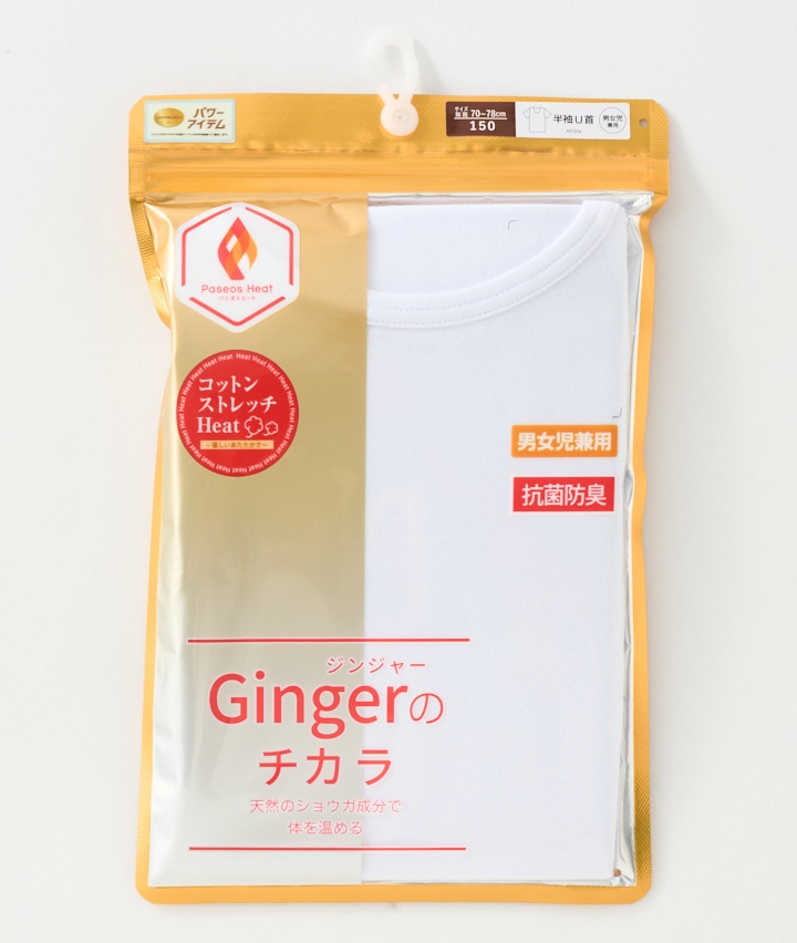 【Gingerのチカラ】【コットンストレッチHeat】(吸湿発熱)(抗菌防臭)(綿混素材)(ストレッチ)(保温)(型崩れ防止)(男女児兼用)半袖U首肌着
