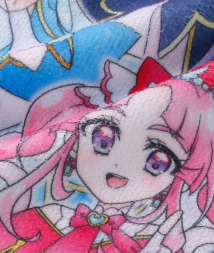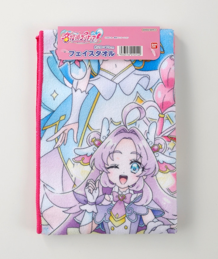 ・名探偵プリキュアのフェイスタオルです。表面がポリエステル、裏面がマイクロファイバー素材。