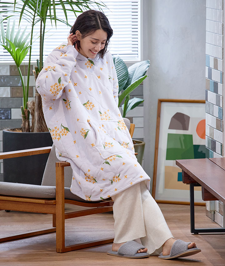 ・生活の木のカレンデュラオイルで保湿加工を施した着る毛布。肌にしっとりうるおいを与えながら、ふんわりあったか生地が冷えやすい季節もやさしく包みます。金木犀の可憐な柄が部屋時間を華やかに彩り、毎日のくつろぎを心地よく。洗濯機で丸洗いでき、清潔さも長続きします。